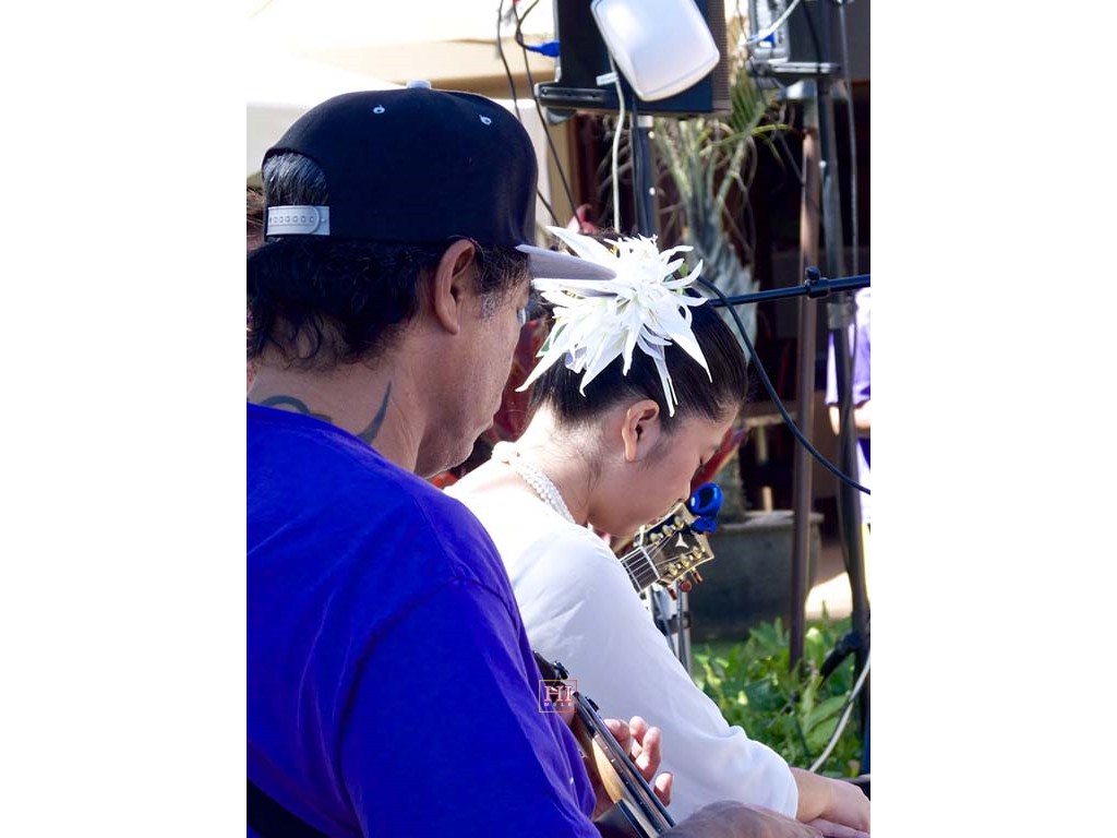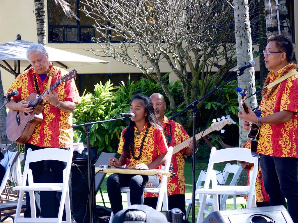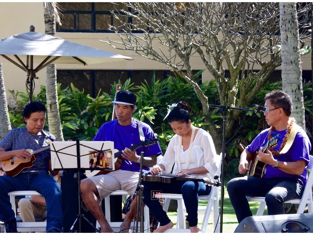 Bobby Ingano on 'ukulele, Ronald Tolentino on u-bass, Alexis Tolentino on the steel guitar, and Alan Akaka on guitar.