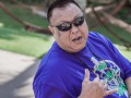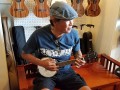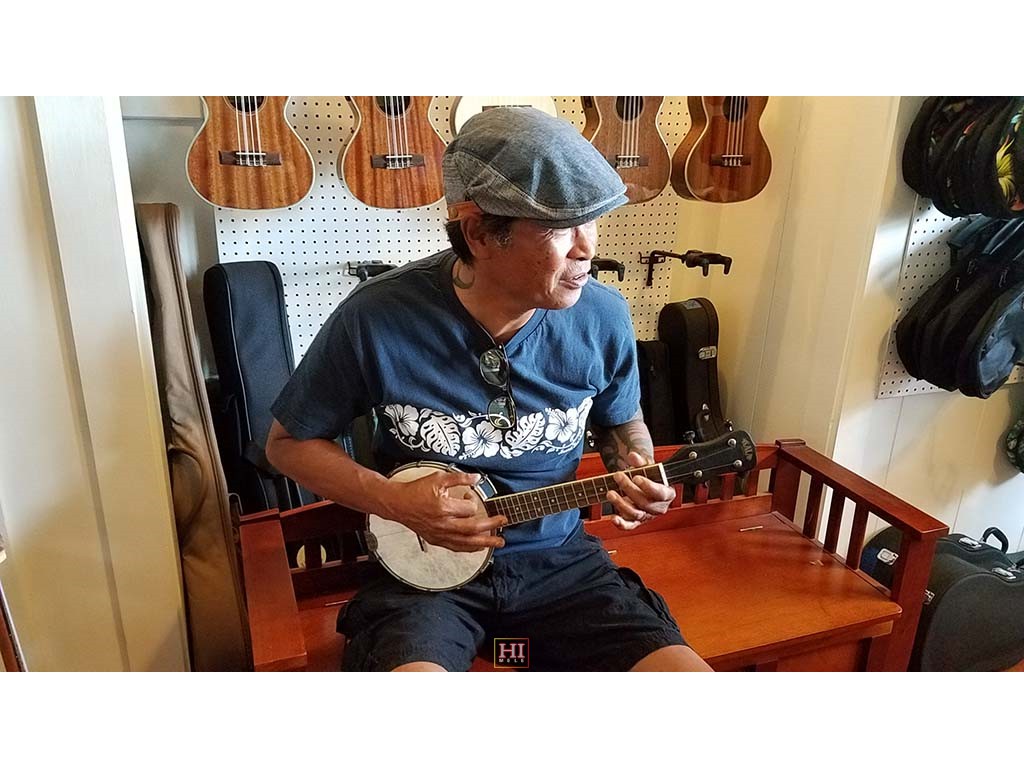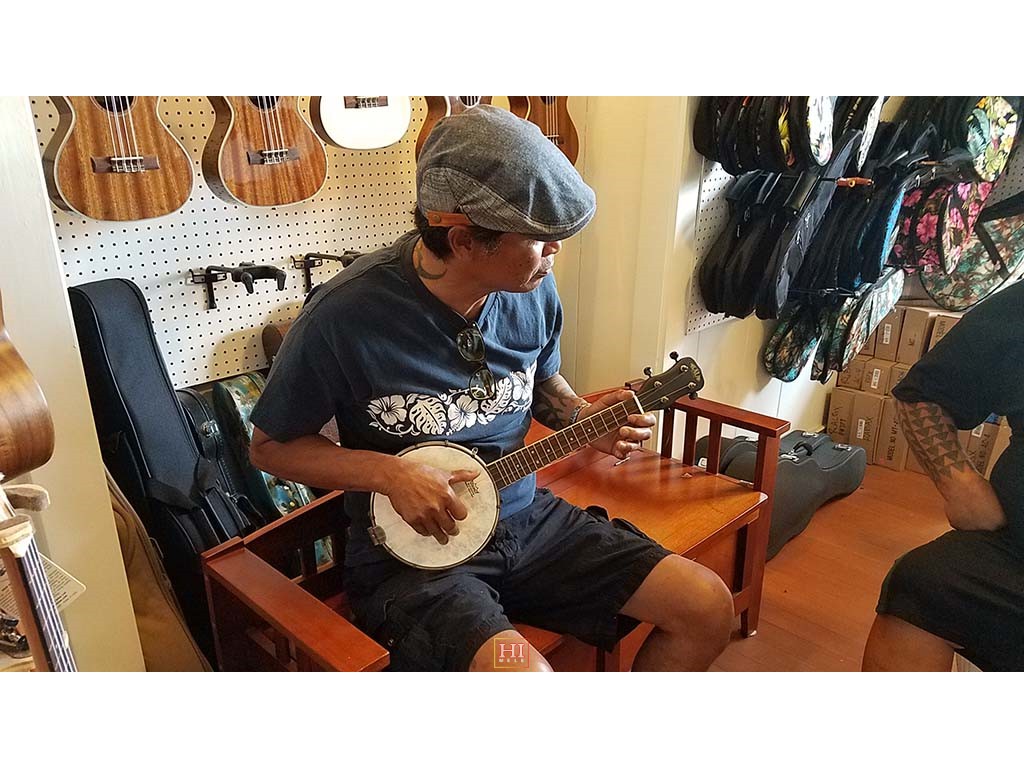 • Ron Tolentino tries his hand at a Banjolele at Scottyʻs Music House in Lihue. Photo by Addison Ching.