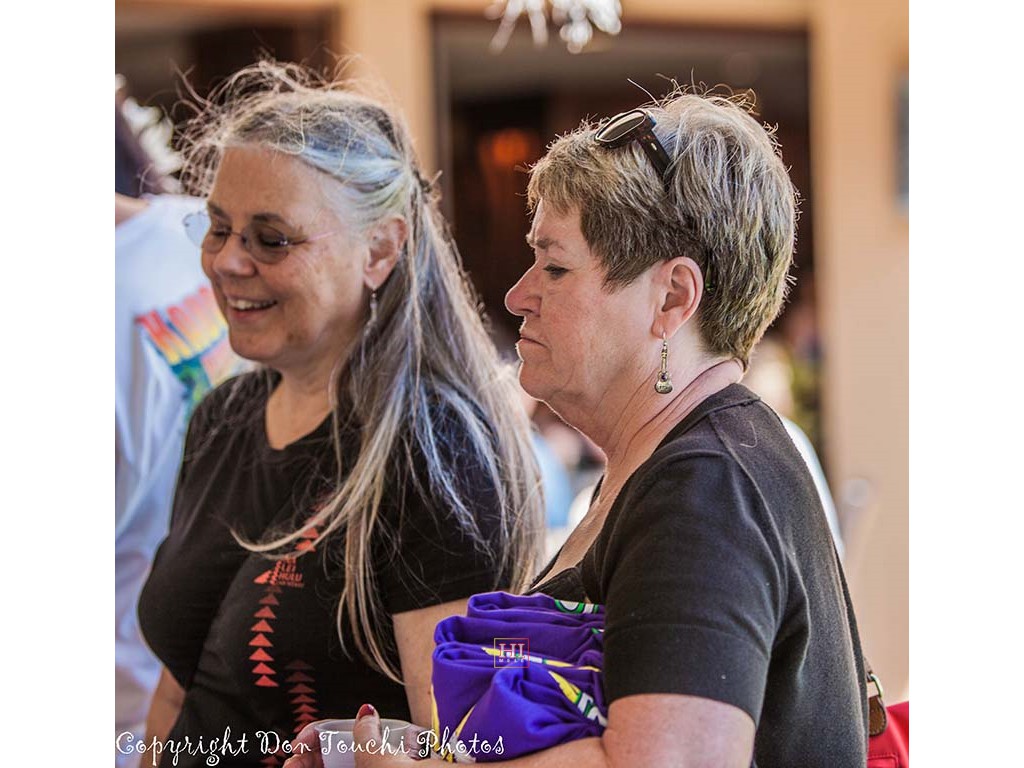 • Jeanne Holbrook Skybrook and Vickie Van Fechtmann getting their festival T-shirts.