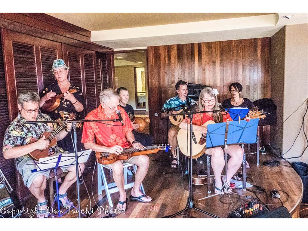 • La Banda, a collection of Aloha Music Camp and Ke Kula Mele musicians. From left: Scott Vilhauer, Rhonda Murotake, Dan Villani, Mary Neudorffer, Tom Lunnenberg, Angela Villani, and Susanne Ramos.