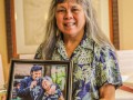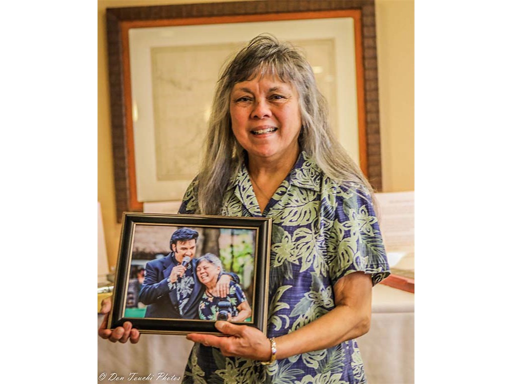 Julie Hendricks with a souvenir from last year's Maui Steel Guitar Festival which included Elvis tribute artist Darren Lee.