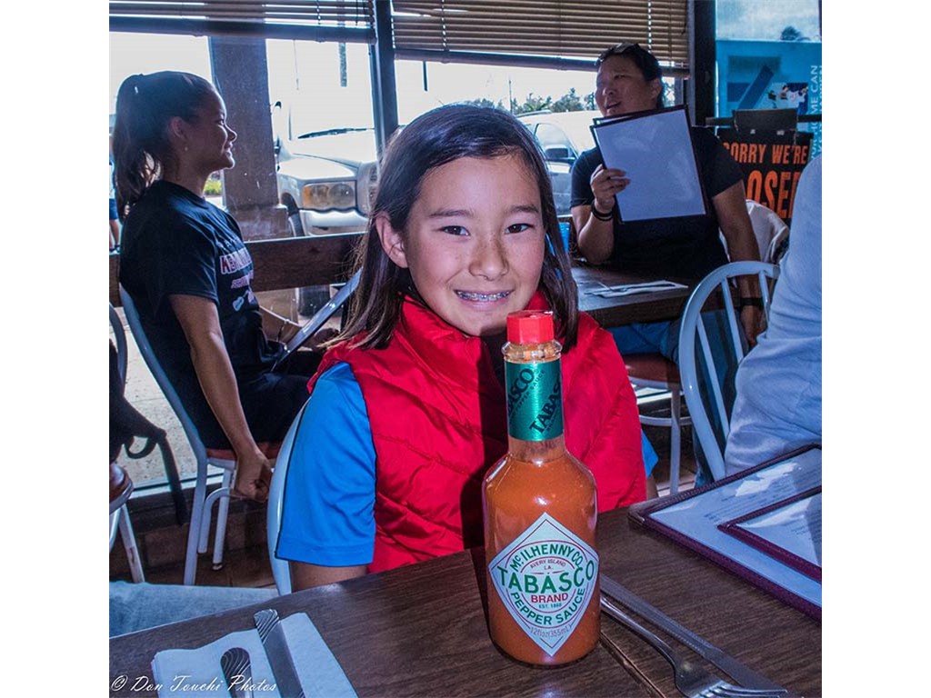Tai has earned the nickname ʻʻTaibascoʻʻ for her culinary preference. Sister Joey and mom SooJean are in the background.