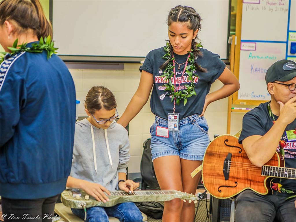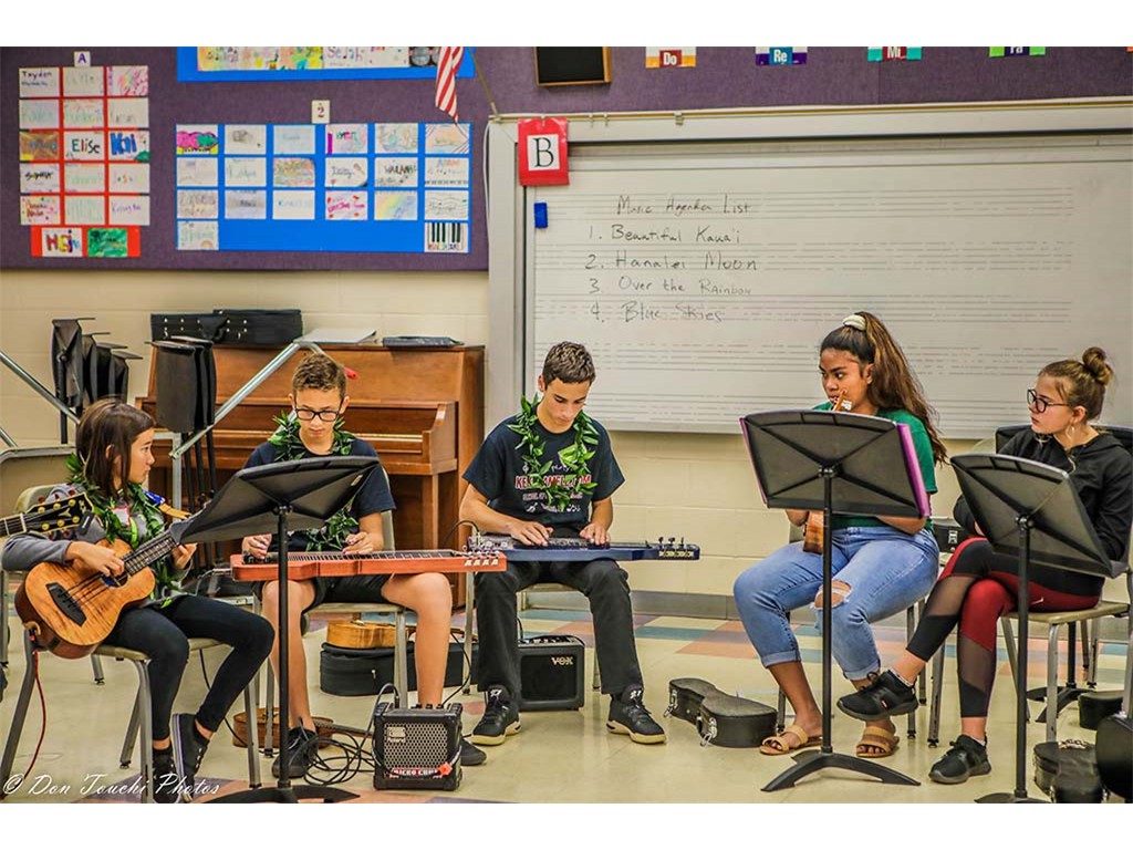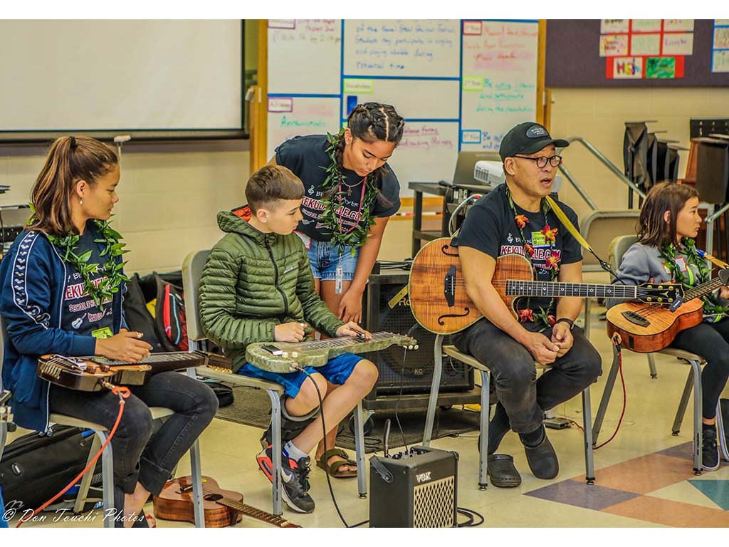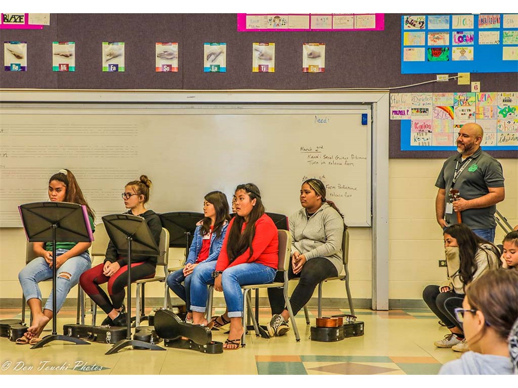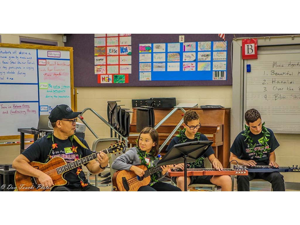 A school demonstration team visited the Chiefess Kamakahelei Middle School to provide a presentation about the Hawaiian Steel Guitar showing students why the instrument is important to Hawaiian music and culture, providing musical selections that include the steel guitar, and giving students hands-on experiences with the instruments.