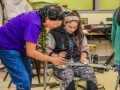 Mālie Lyman shows a student how to play the steel guitar as Joey looks on. Kumu Alan Akaka and Tai field audience questions.