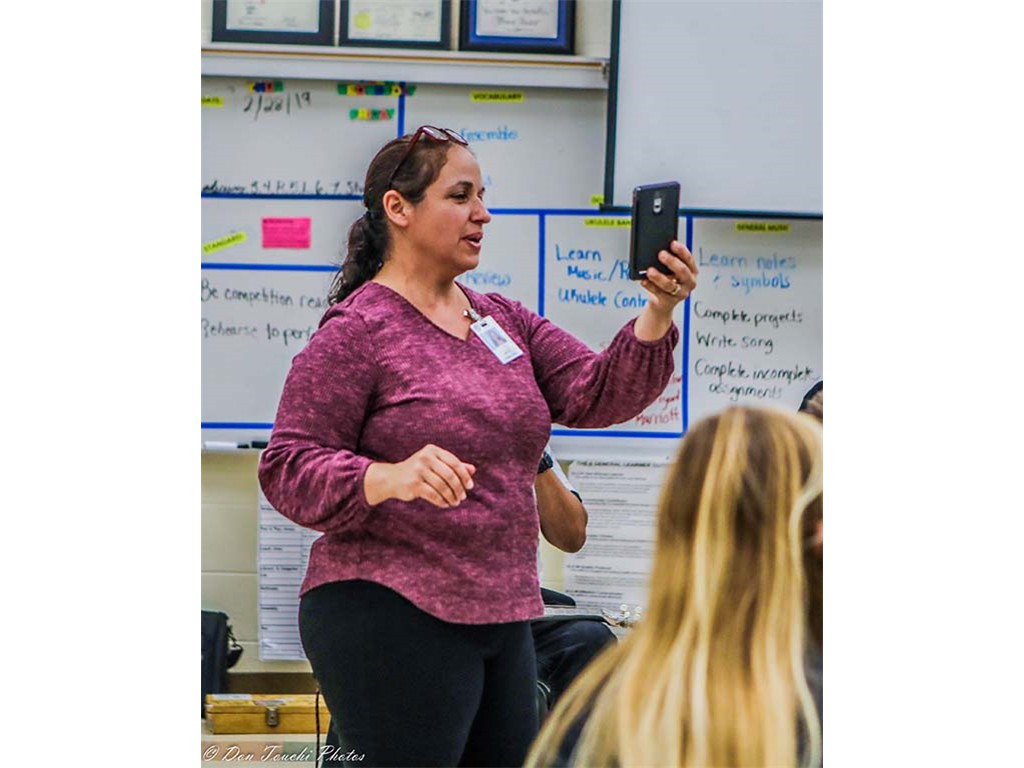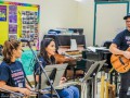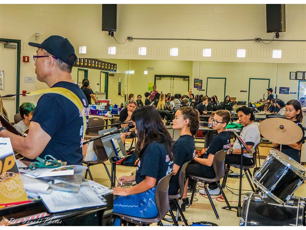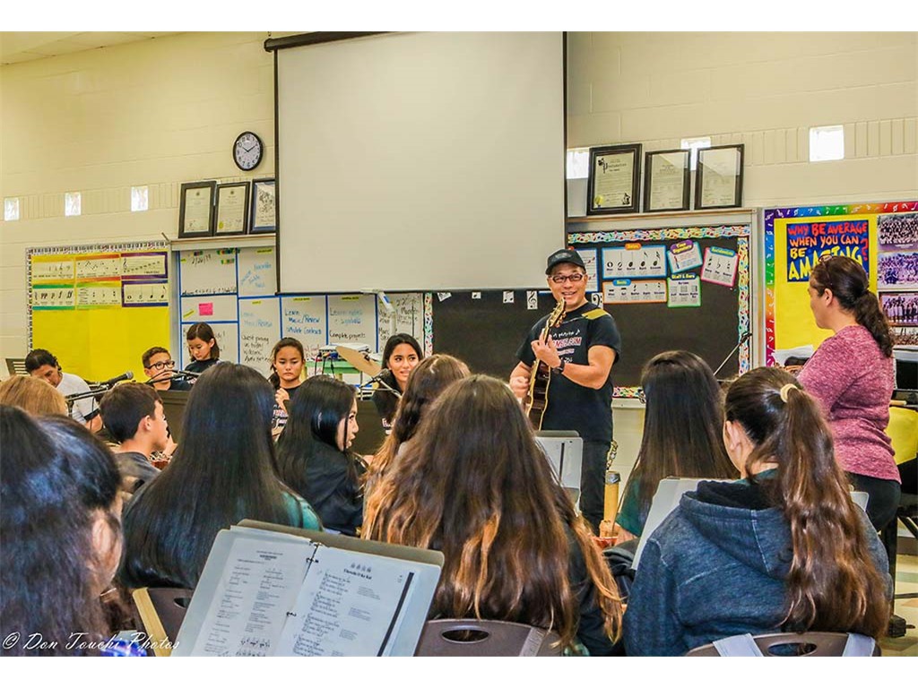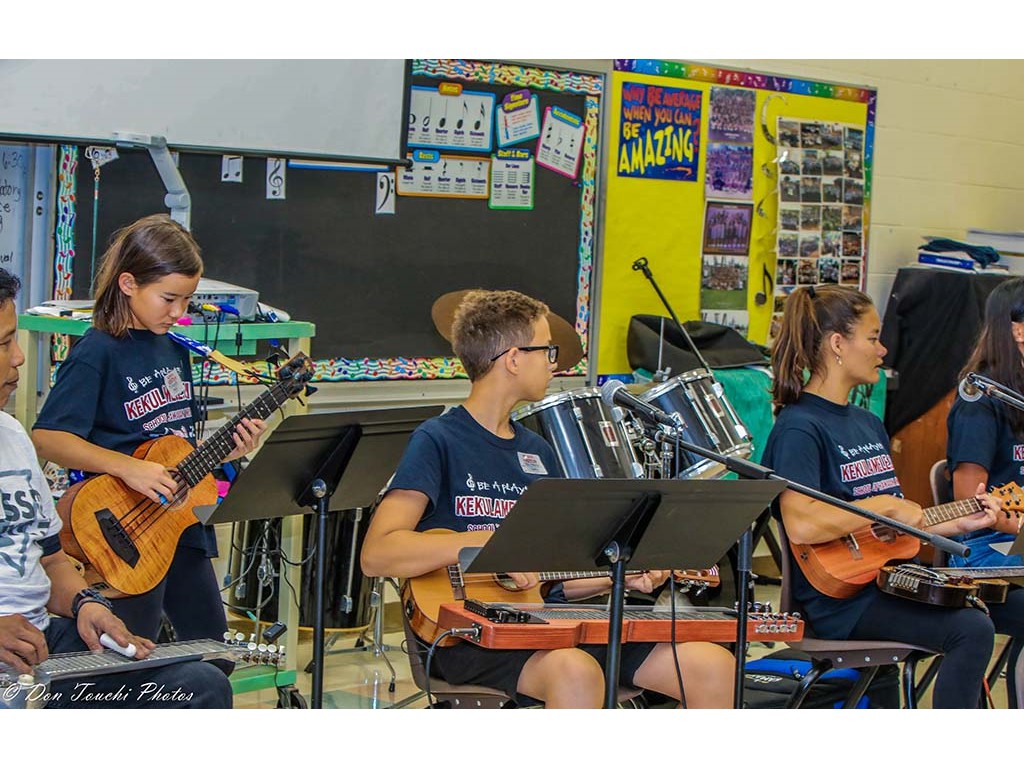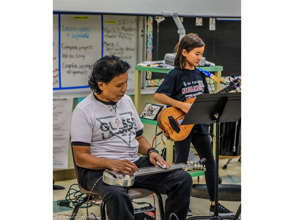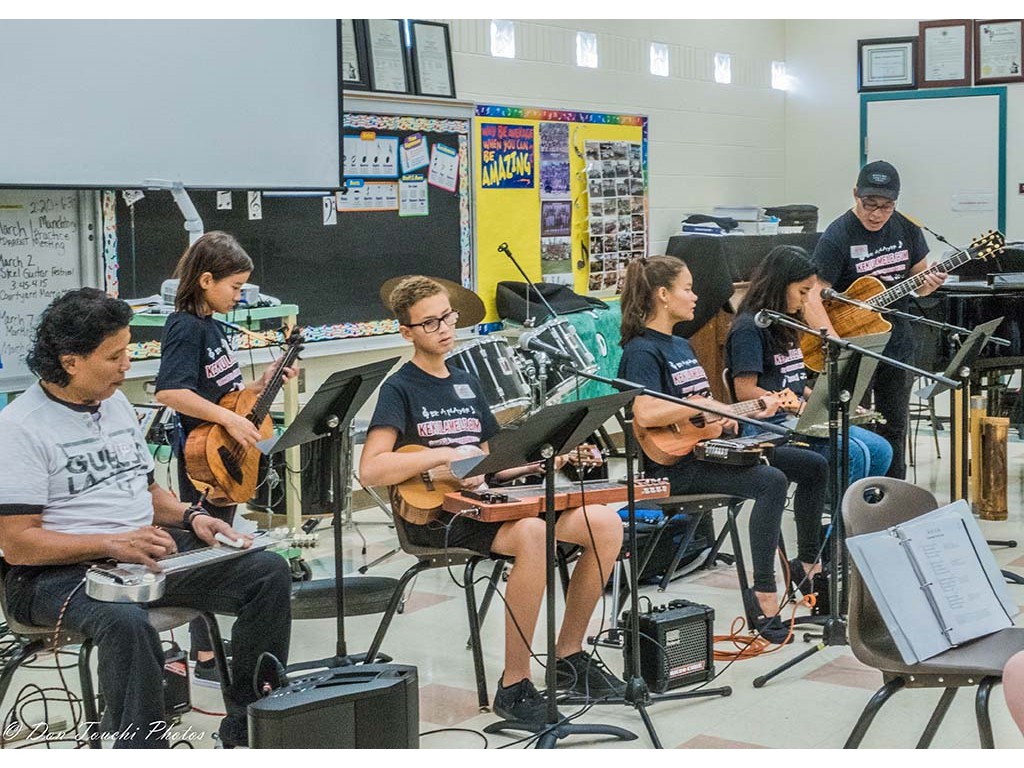 Kapa‘a Middle School was one of two schools visited by school presentation teams to provide information about the Hawaiian Steel Guitar. The presentation included a history of the Hawaiian steel guitar, and why the instrument is important to Hawaiian music and culture. Musical selections that included the steel guitar were also performed to show the students how the instrument integrates with Hawaiian music. Students were also provided opportunities for hands-on experiences with the instruments.