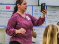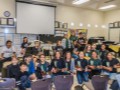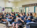 The presentation team set up in front of the class. A reflection of the class is seen in the background mirrors.
