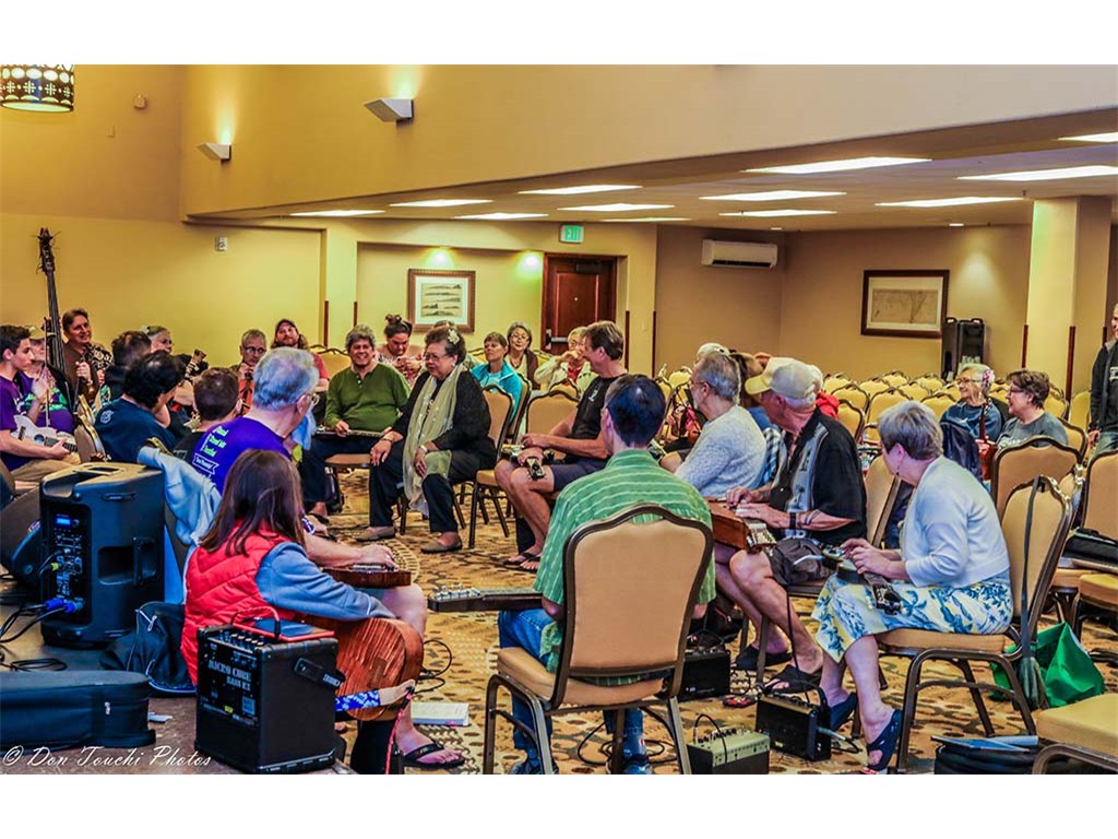 The Friday evening Kanikapila was held in the Paddle Room and well-attended. Steel guitarists made sat in the inner circle.