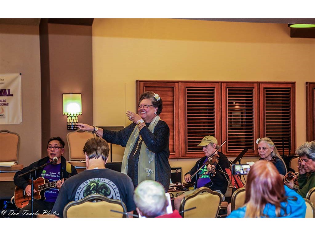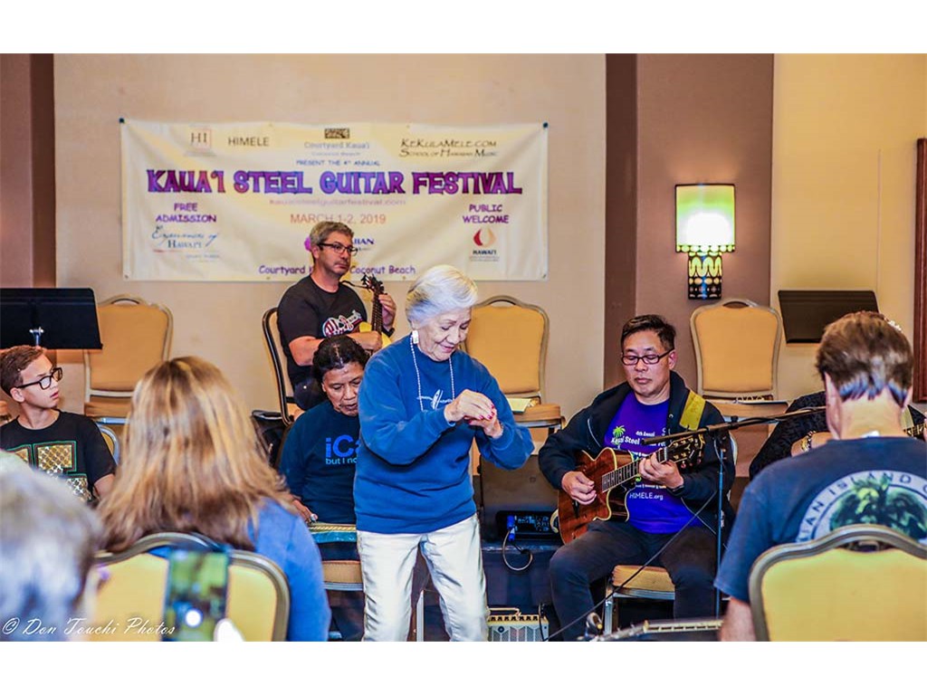 Kumu Hula Beverly Muraoka also joined in the fun. She is flanked on her right by Greg Sardinha and on her left by Kaua'i Steel Guitarist Jess Montgomery.
