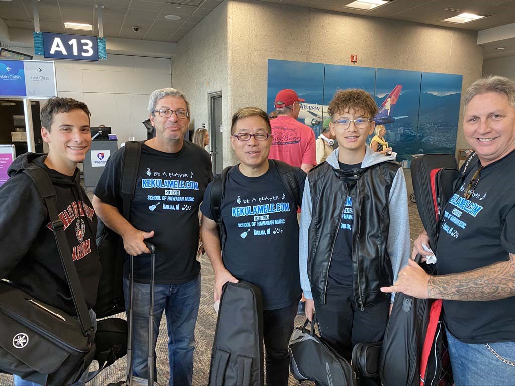 • School visitation team awaiting their Kauaʻi flight. From left: Ethan and Natan Goore, Alan Akaka, Pono and Jake Fernandez. Photo by Alan Akaka.