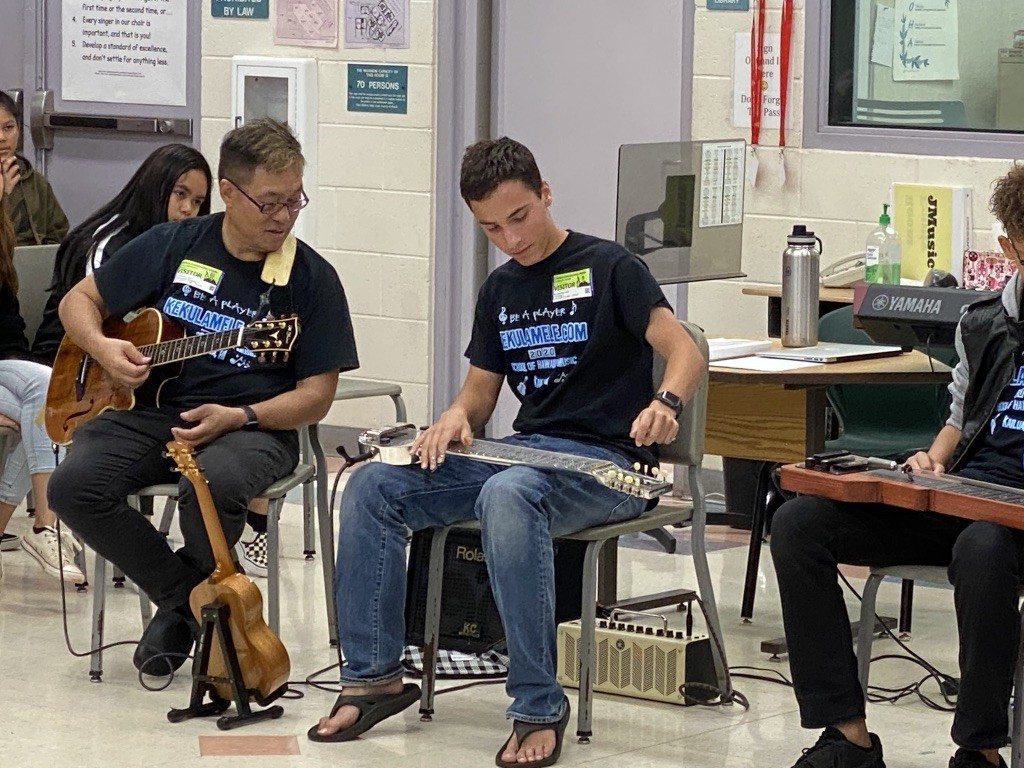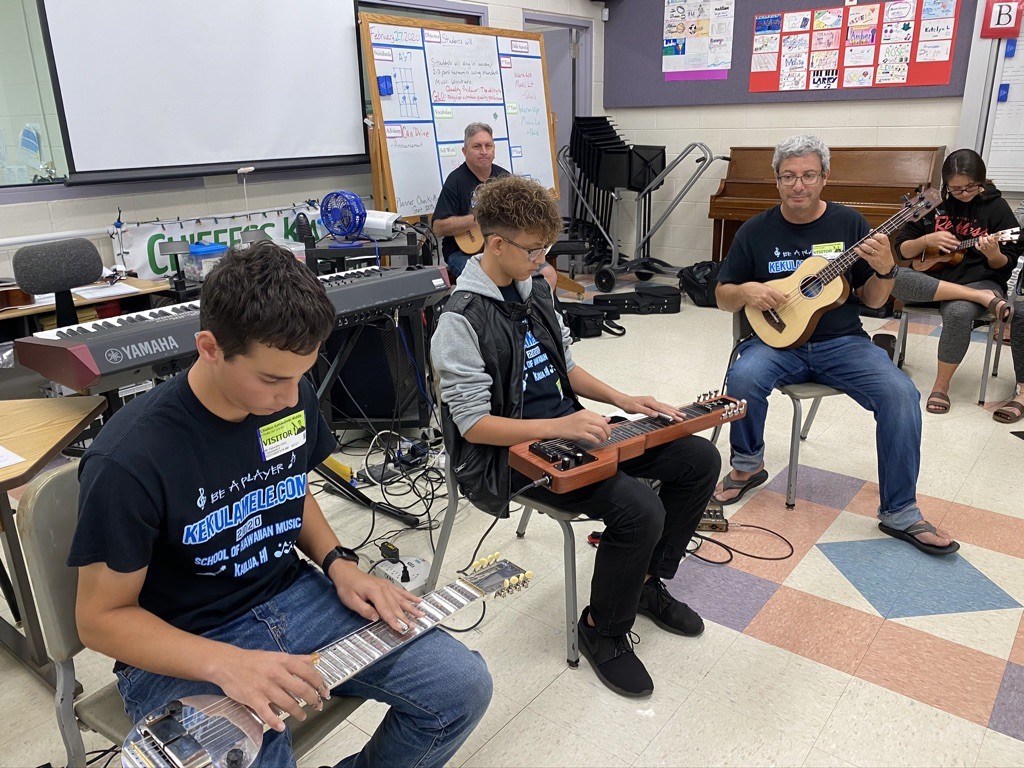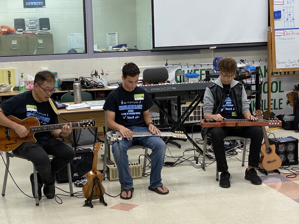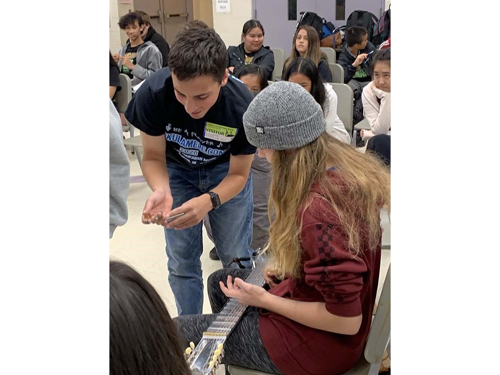 A school demonstration team with NextGen steel guitarists Ethan Goore and Pono Fernandez visited the Chiefess Kamakahelei Middle School to provide a presentation about the Hawaiian Steel Guitar showing students why the instrument is important to Hawaiian music and culture, providing musical selections that include the steel guitar, and giving students hands-on experiences with the instruments. Ethan and Pono were joined by Alan Akaka and Natan Goore who provided musical backup.