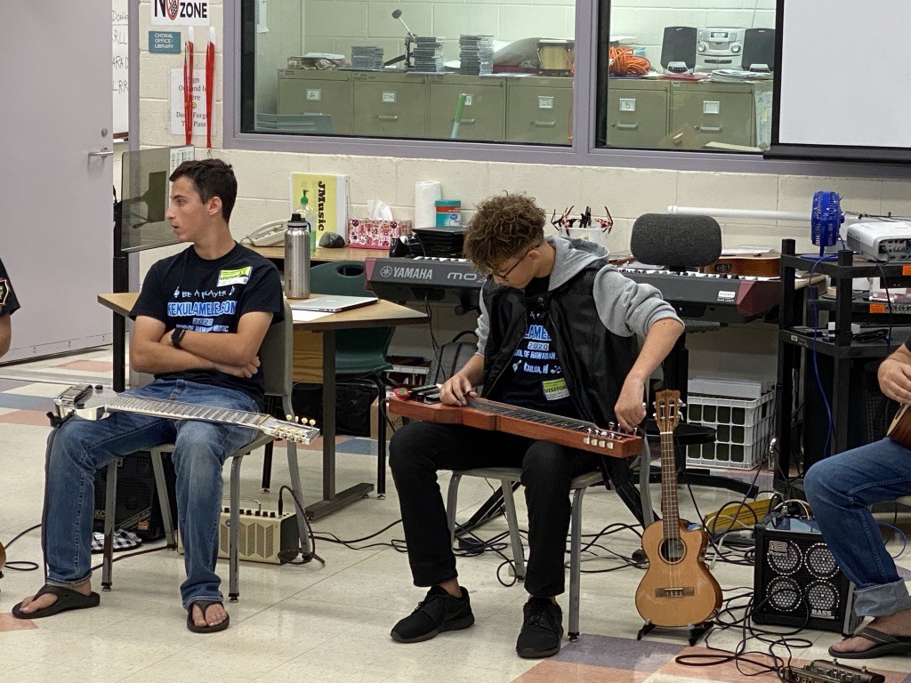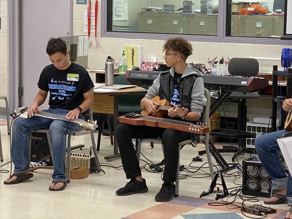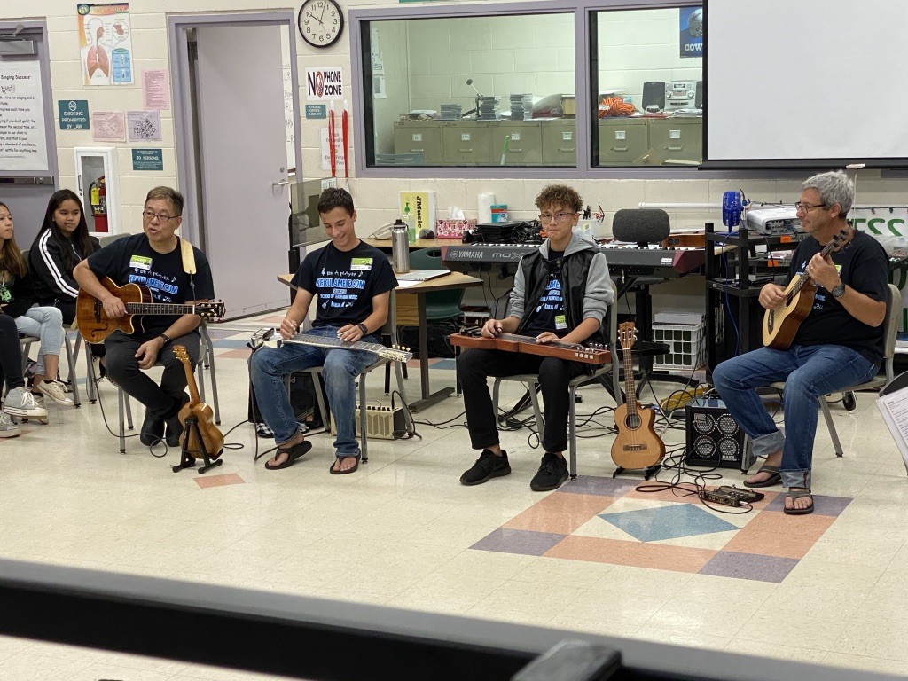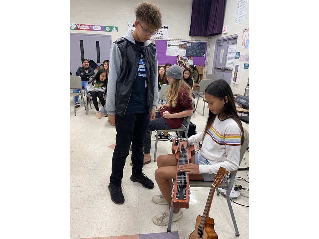 A school demonstration team with NextGen steel guitarists Ethan Goore and Pono Fernandez visited the Chiefess Kamakahelei Middle School to provide a presentation about the Hawaiian Steel Guitar showing students why the instrument is important to Hawaiian music and culture, providing musical selections that include the steel guitar, and giving students hands-on experiences with the instruments. Ethan and Pono were joined by Alan Akaka and Natan Goore who provided musical backup.