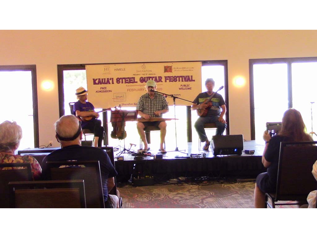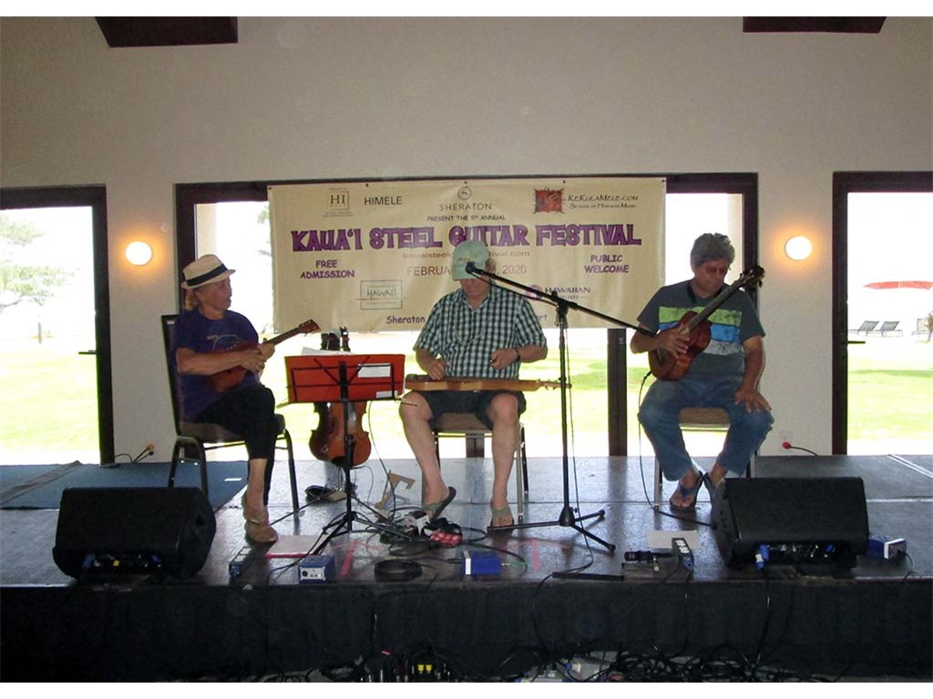Steel guitarist Jess Montgomery with Dennis Chun on guitar and Greg Sardinha on U-bass.