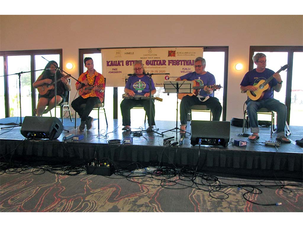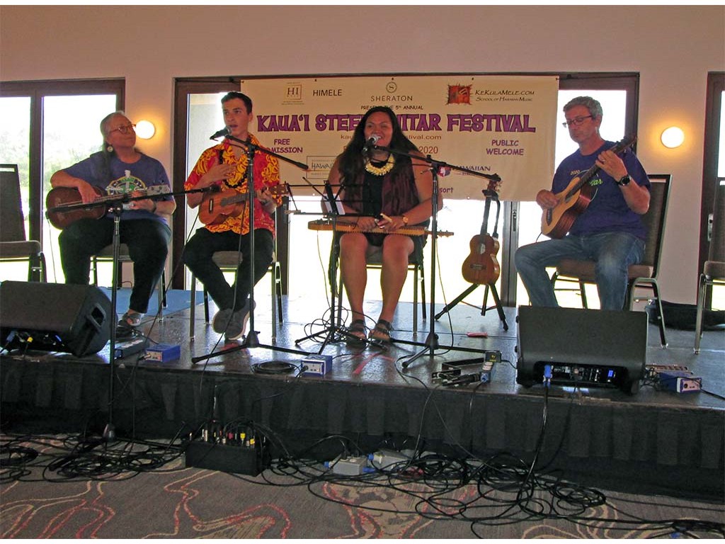 Steel guitarist Heuʻi Bandmann with Rhonda Murotake, Ethan Goore, and Natan Goore.