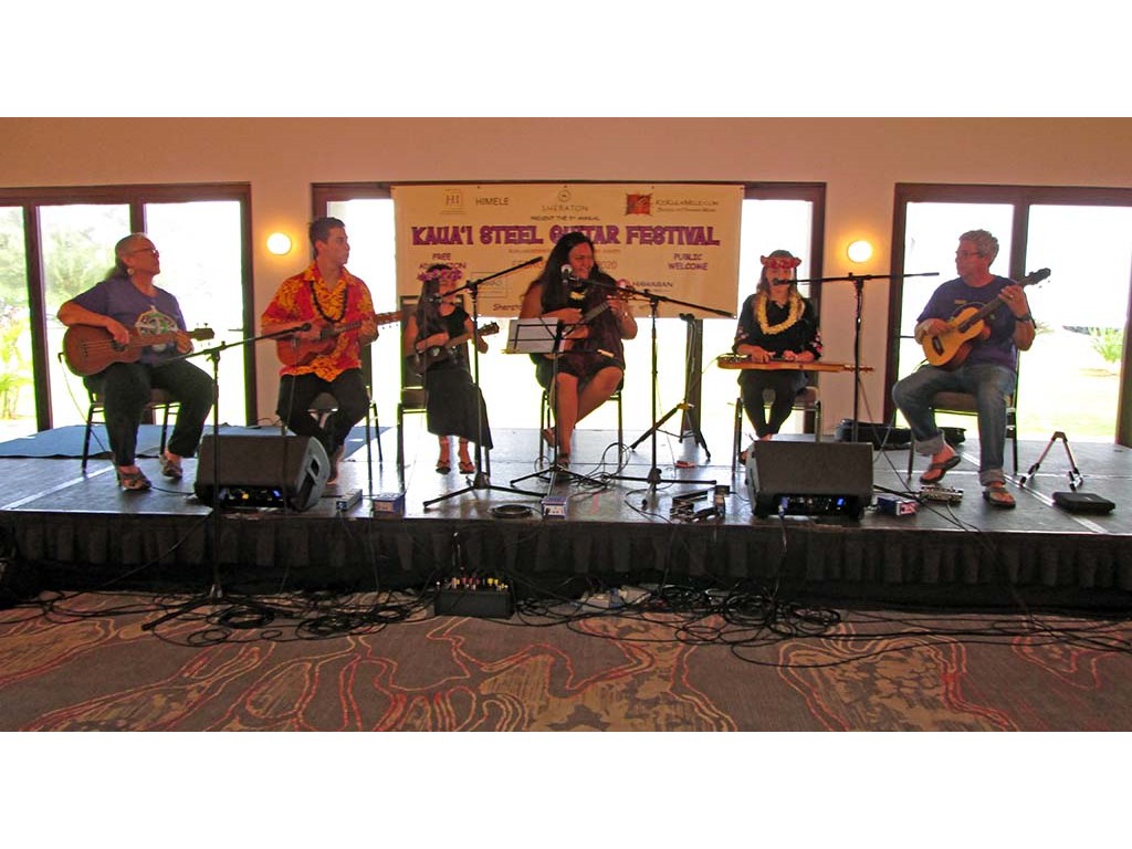 Steel guitarist Rhonda Murotake with Heuʻi Bandmann, Ethan Goore, Scott Vilhauer, and Natan Goore.