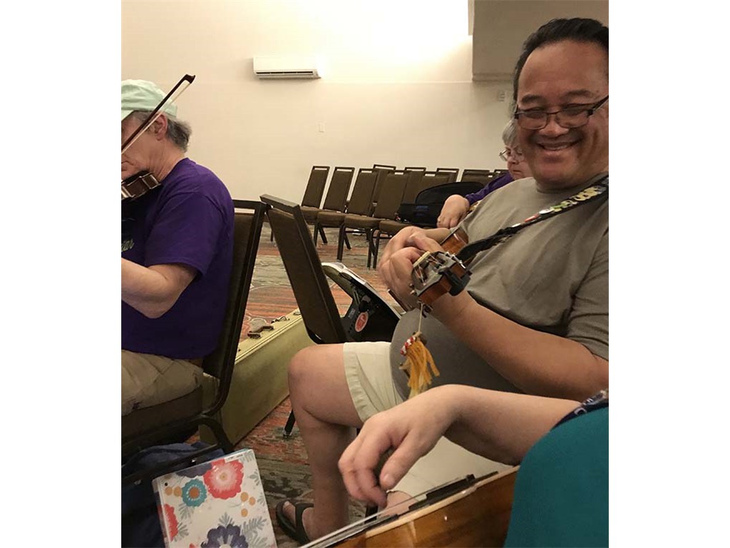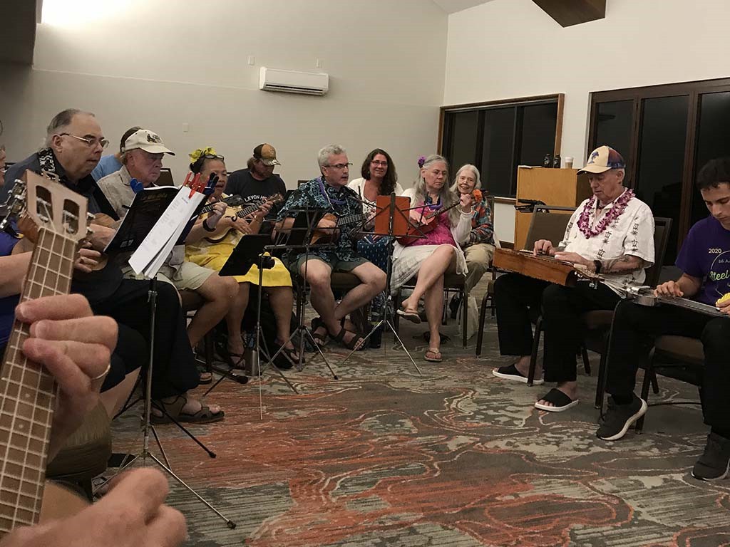 A public kanikapila was held in the Makai Room on Saturday after the evening workshops. The group included many Aloha Music Camp participants.