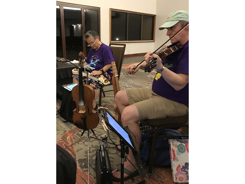 Rebecca Woo on the steel guitar and Mark Gaponoff on the fiddle.