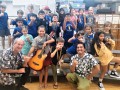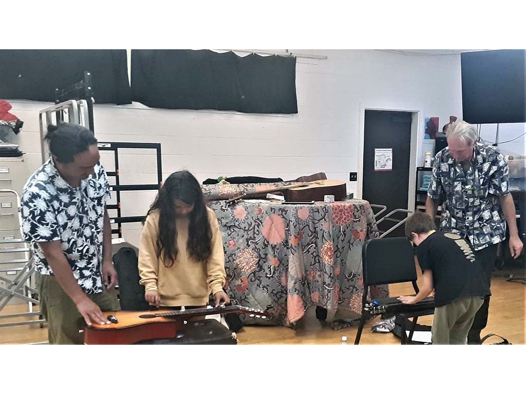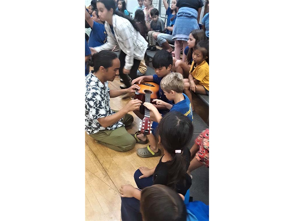 Maluhia Castillo and students try out the steel guitar.