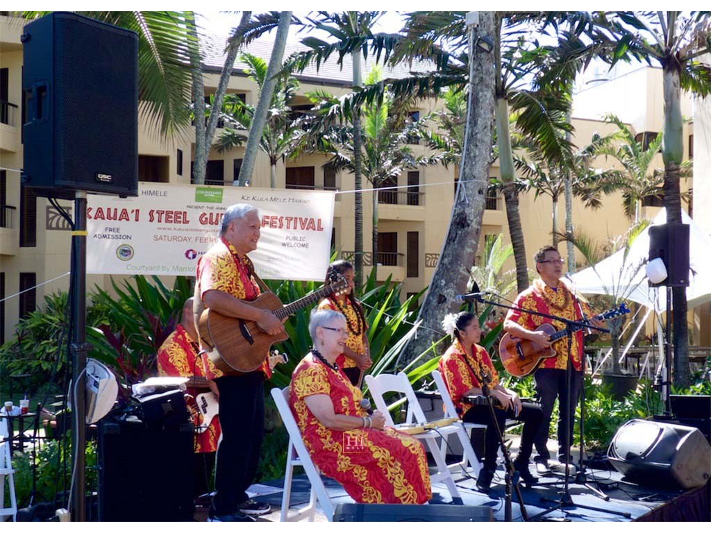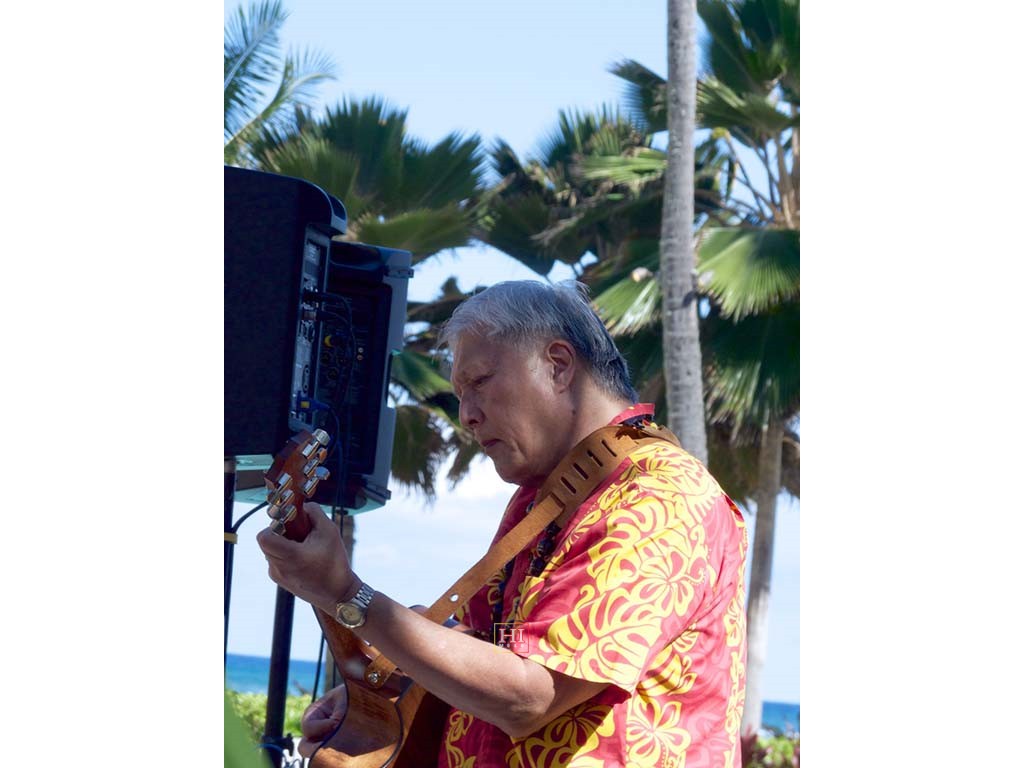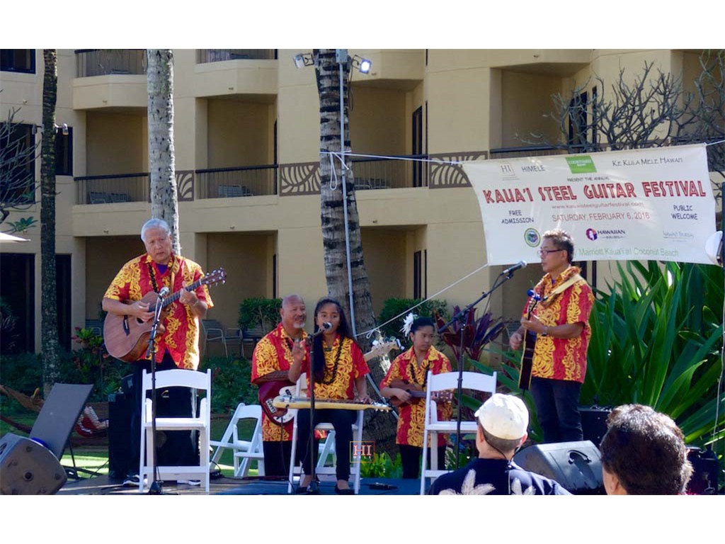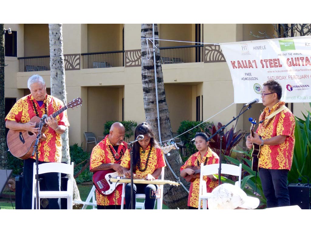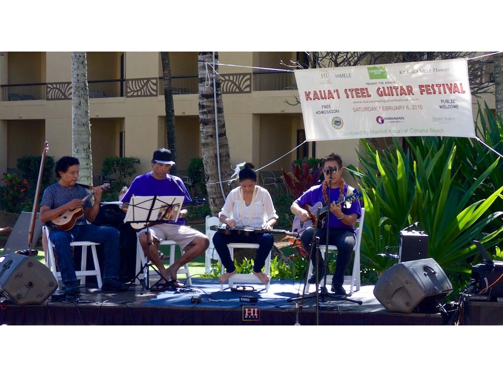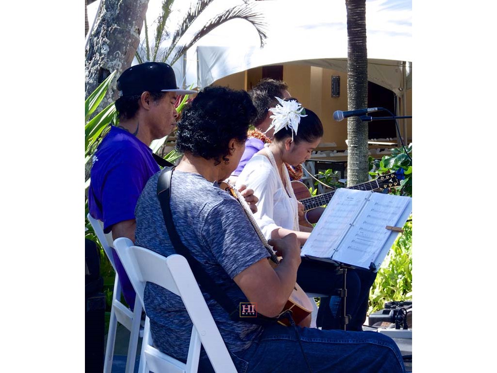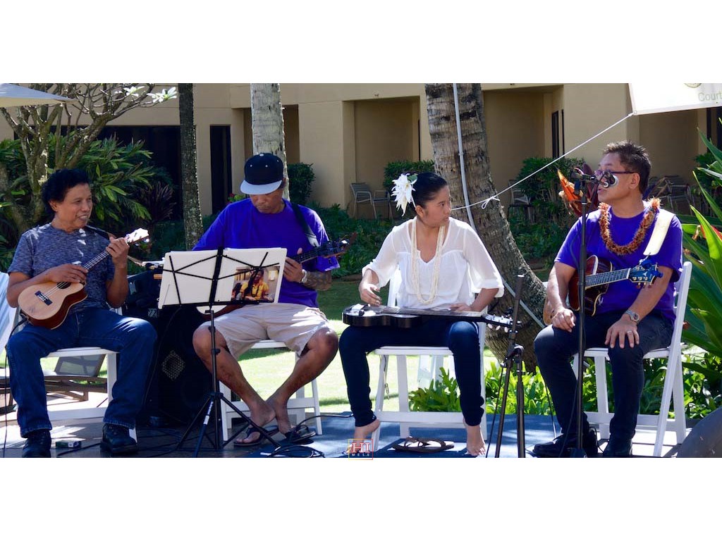 Bobby Ingano on 'ukulele, Ronald Tolentino on u-bass, Alexis Tolentino on the steel guitar, and Alan Akaka on guitar.