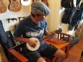 • Ron Tolentino tries his hand at a Banjolele at Scottyʻs Music House in Lihue. Photo by Addison Ching.