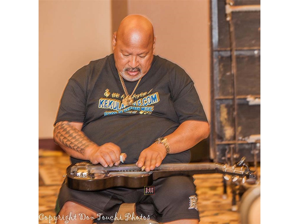 Larry Holu demonstrates on Alexisʻ steel guitar.