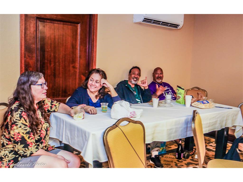 Downtime at the steel exhibit table with Judy Van Sickle Maierhofer, Sandy Sardinha, Geri Valdriz, and Larry Holu.