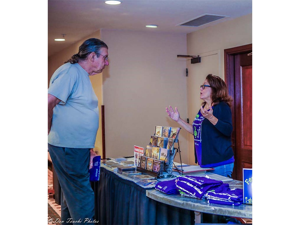 Julie Hendricks with a souvenir from last year's Maui Steel Guitar Festival which included Elvis tribute artist Darren Lee.