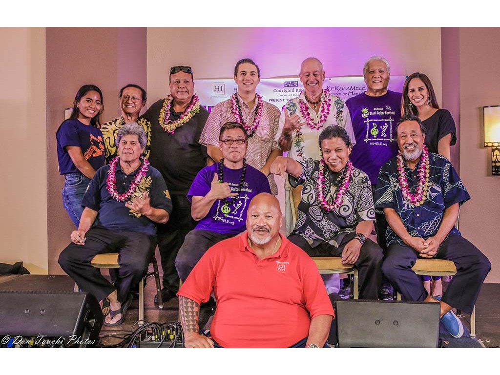 Some members of the Kauaʻi Steel Guitar Festival class of 2019. Front: Greg Sardinha, Alan Akaka, Larry Holu, Bolbby Ingano, Geri Valdriz. Rear: Mālie Lyman, Kekai Chock, Kaipo Asing, Kapono Lopes, Dave ʻʻDKʻʻ Kolars, Addison Ching, Pomaikaʻi Lyman.