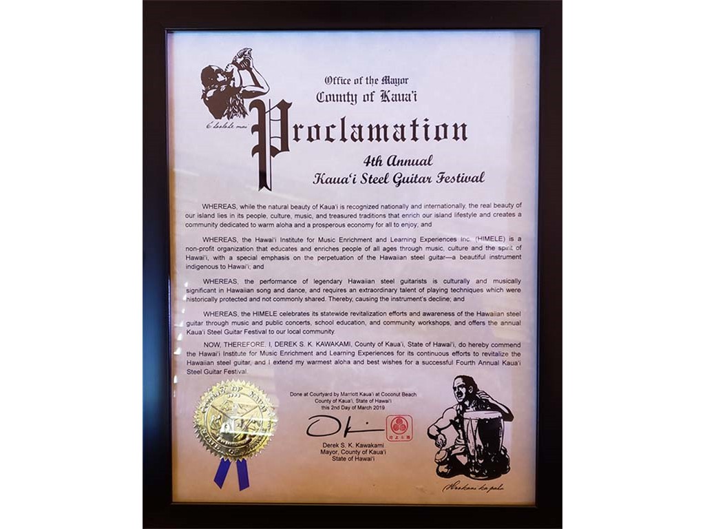 The Mayoral Proclamation presented by Kauaʻi County Mayor Derek Kawakami to the festival.Back to Gallery: 2019 Festival