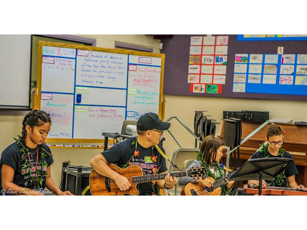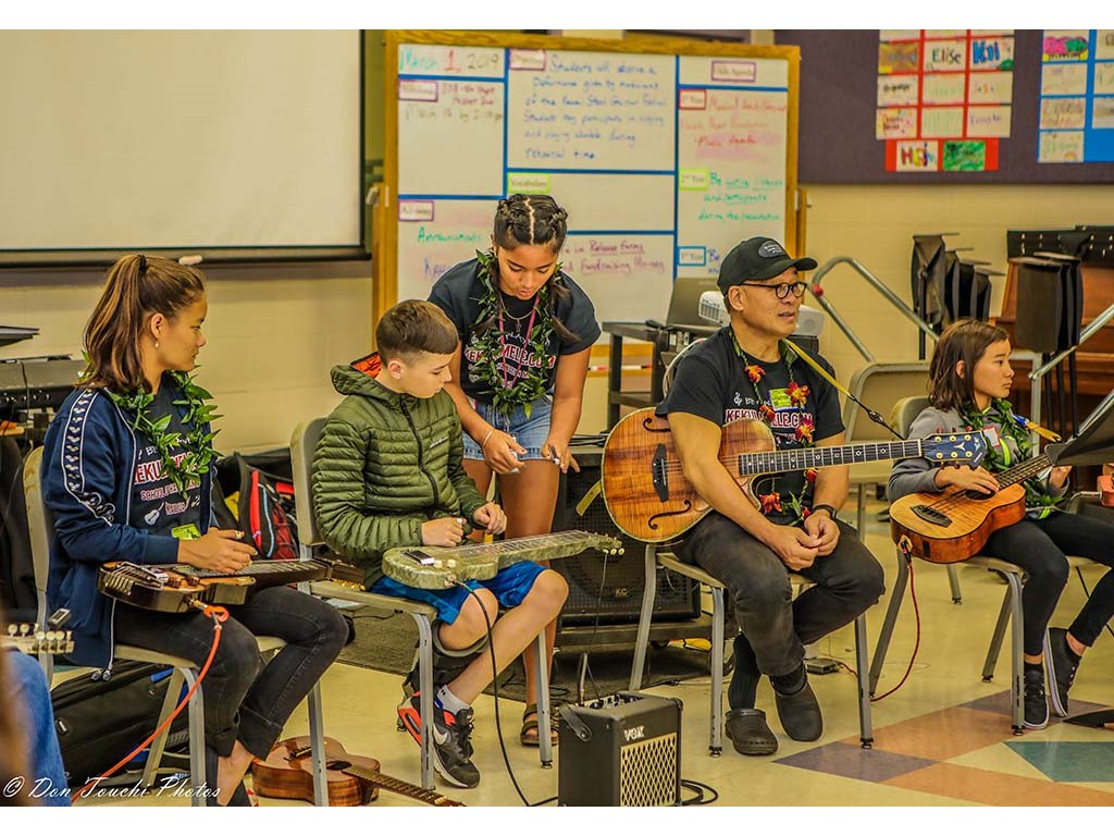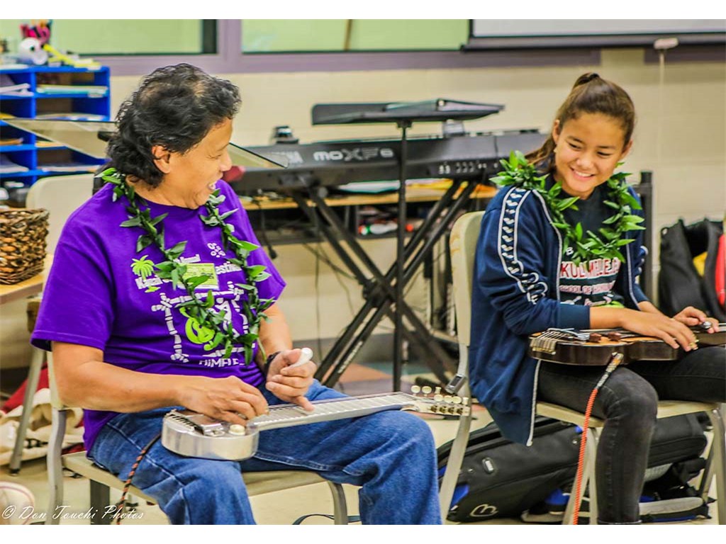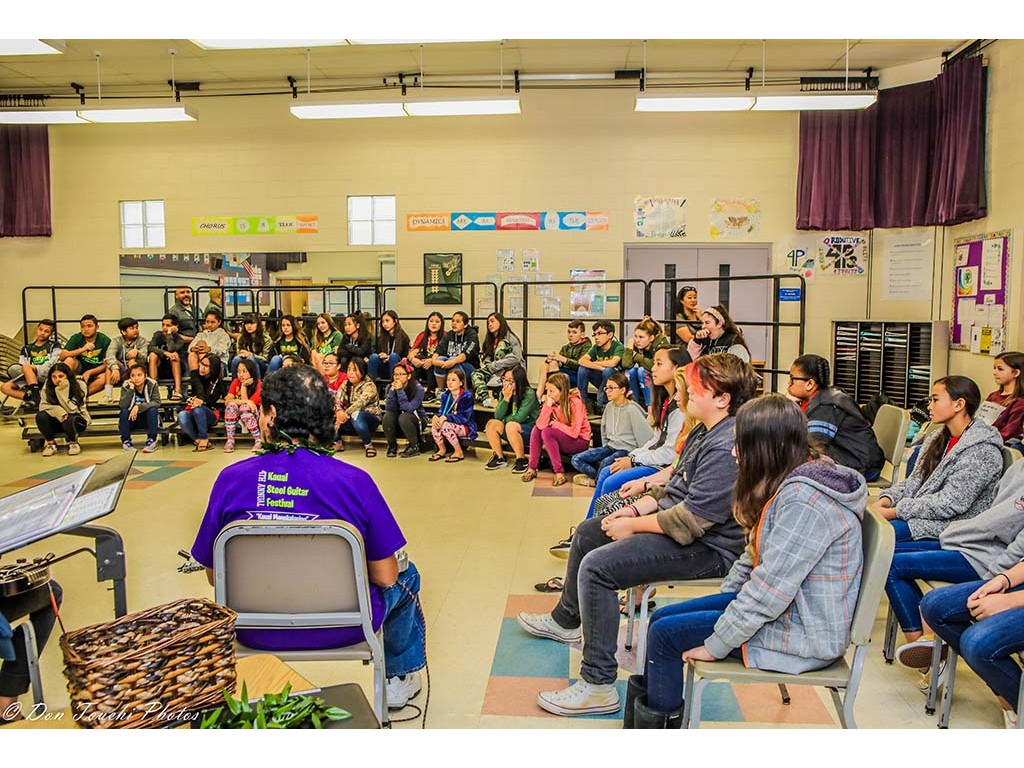 A school demonstration team visited the Chiefess Kamakahelei Middle School to provide a presentation about the Hawaiian Steel Guitar showing students why the instrument is important to Hawaiian music and culture, providing musical selections that include the steel guitar, and giving students hands-on experiences with the instruments.
