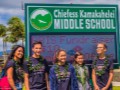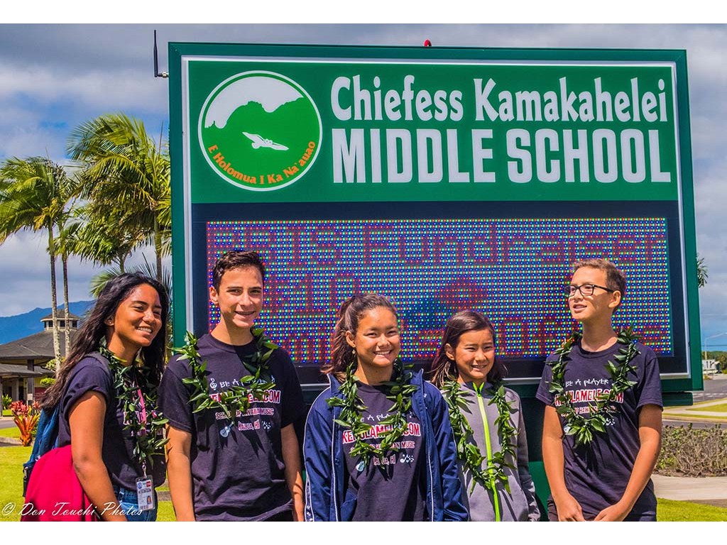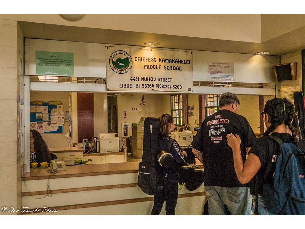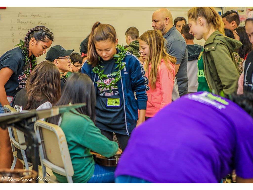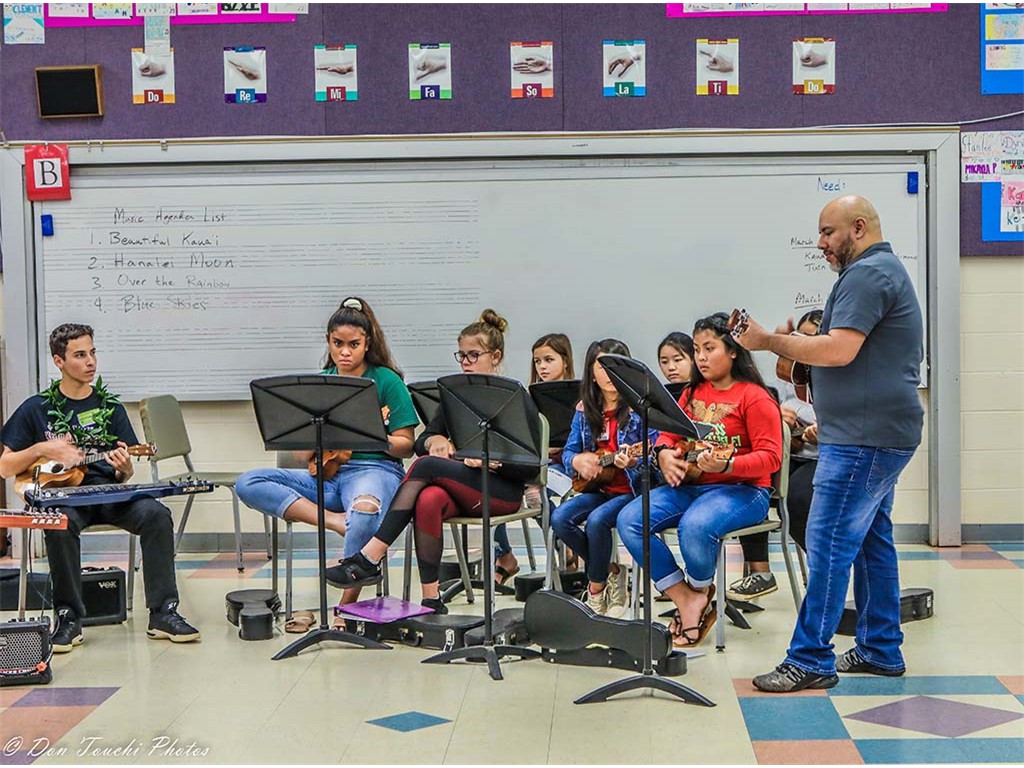 A school demonstration team visited the Chiefess Kamakahelei Middle School to provide a presentation about the Hawaiian Steel Guitar showing students why the instrument is important to Hawaiian music and culture, providing musical selections that include the steel guitar, and giving students hands-on experiences with the instruments.