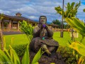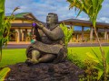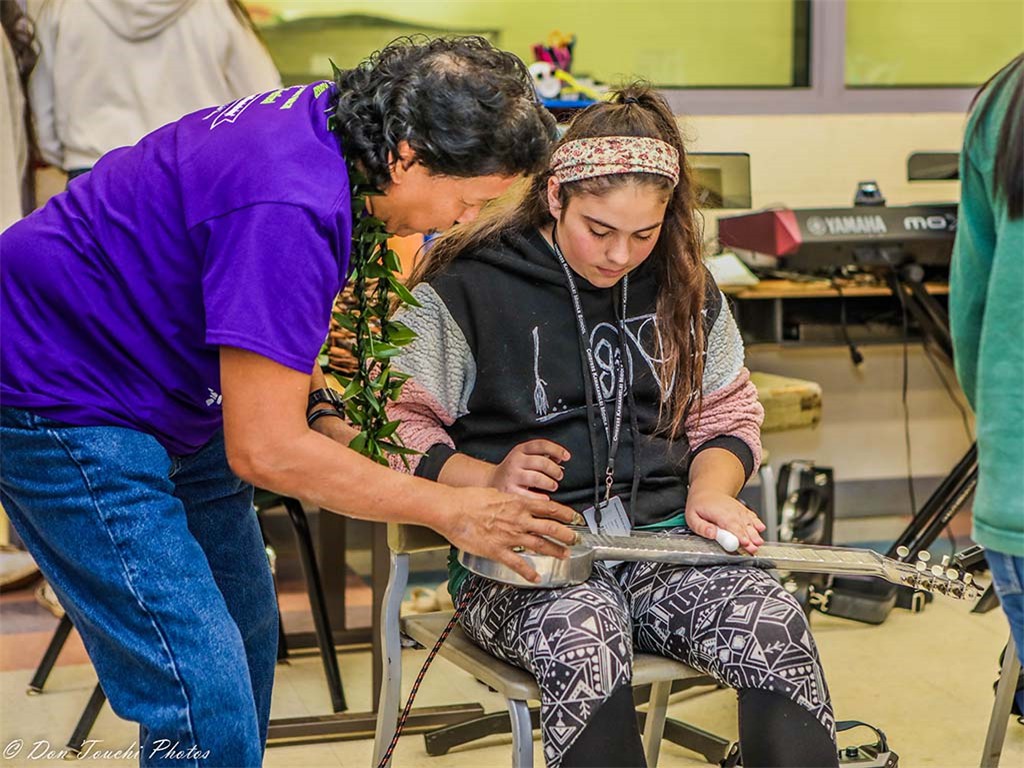 Mālie oversees yet another student interested in trying out the steel guitar. Hint: Rest your left hand fourth and fifth fingers on the string to prevent unwanted sympathetic vibrations.