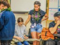 Mālie Lyman shows a student how to play the steel guitar as Joey looks on. Kumu Alan Akaka and Tai field audience questions.