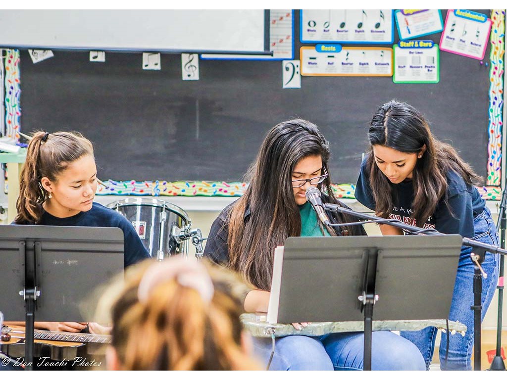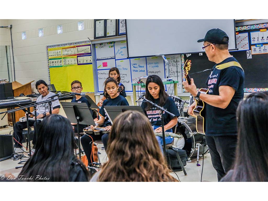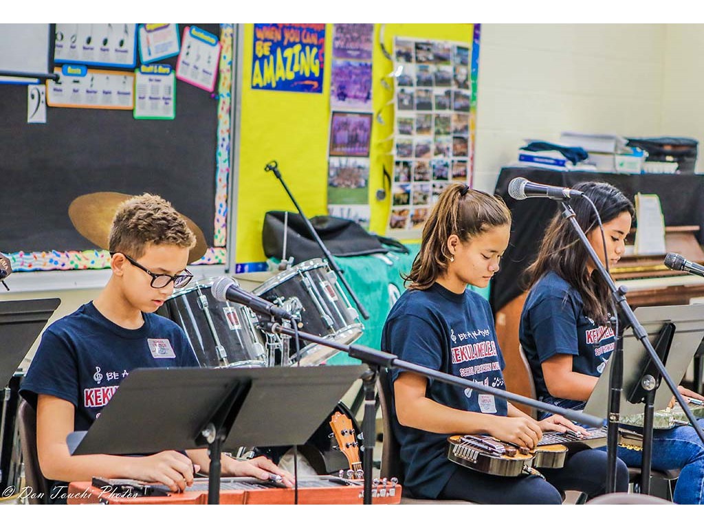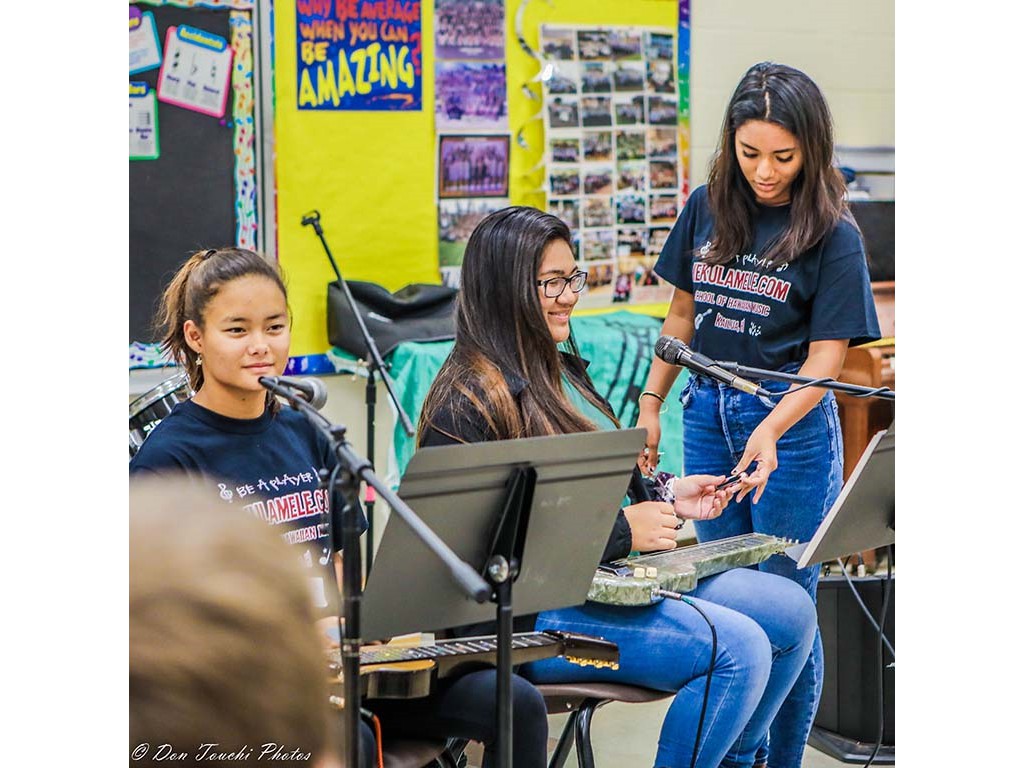 Kapa‘a Middle School was one of two schools visited by school presentation teams to provide information about the Hawaiian Steel Guitar. The presentation included a history of the Hawaiian steel guitar, and why the instrument is important to Hawaiian music and culture. Musical selections that included the steel guitar were also performed to show the students how the instrument integrates with Hawaiian music. Students were also provided opportunities for hands-on experiences with the instruments.
