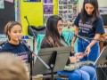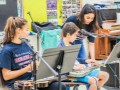 Mālie shows a class student how to hold and position the steel guitar bar while Joey looks on.