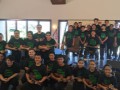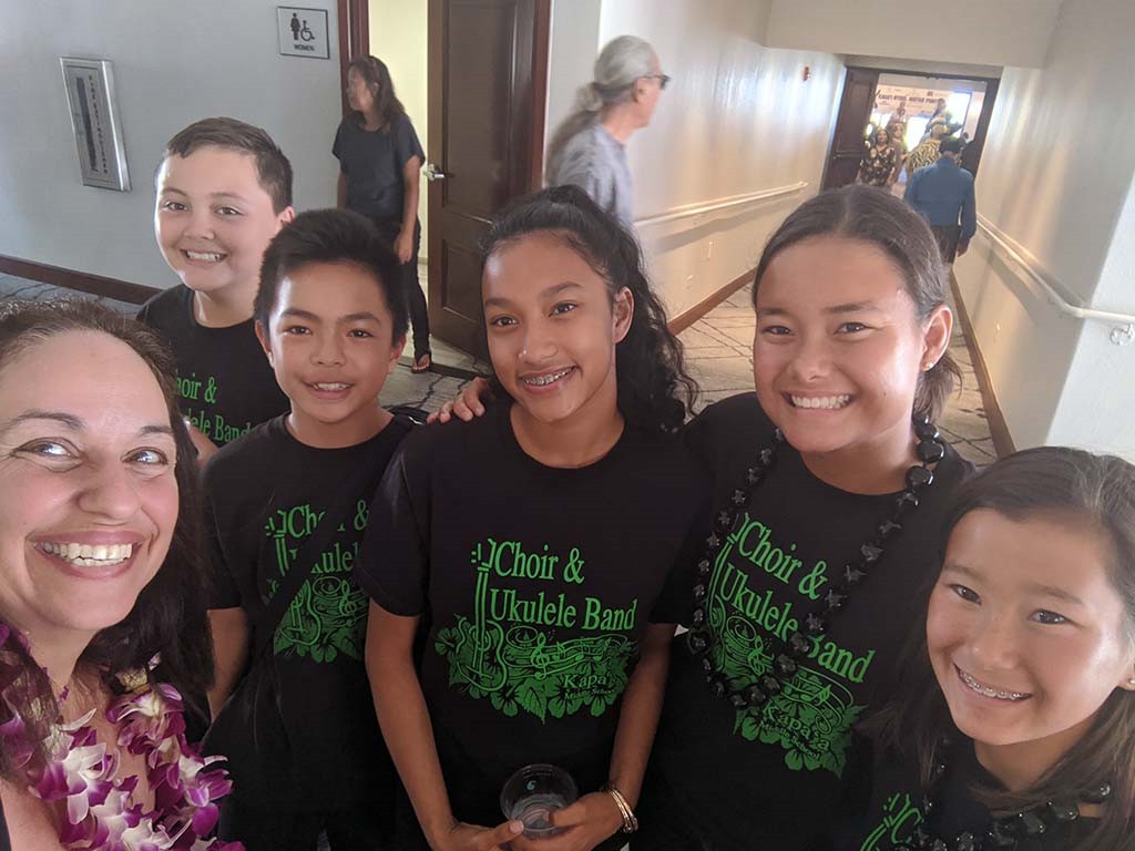 • Kapaʻa Middle School Choir and ʻUkulele Band director Mary Lardizabal with members of the band and Joey and Tai Misailidis. Photo by Mary Lardizabal.