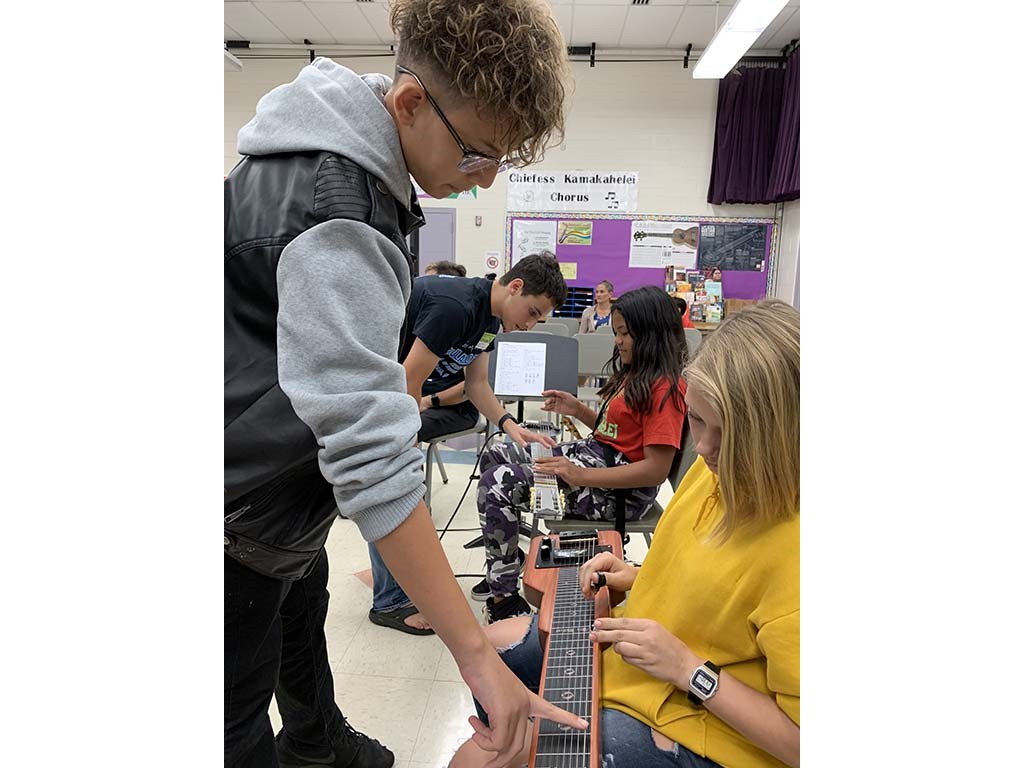 Pono shows this student a fret position on the steel guitar. Photo by Natan Goore.Back to Gallery: 2020 Festival