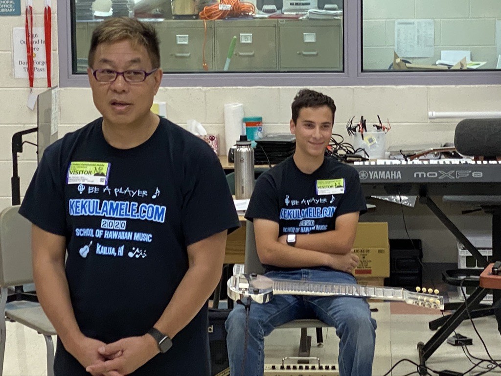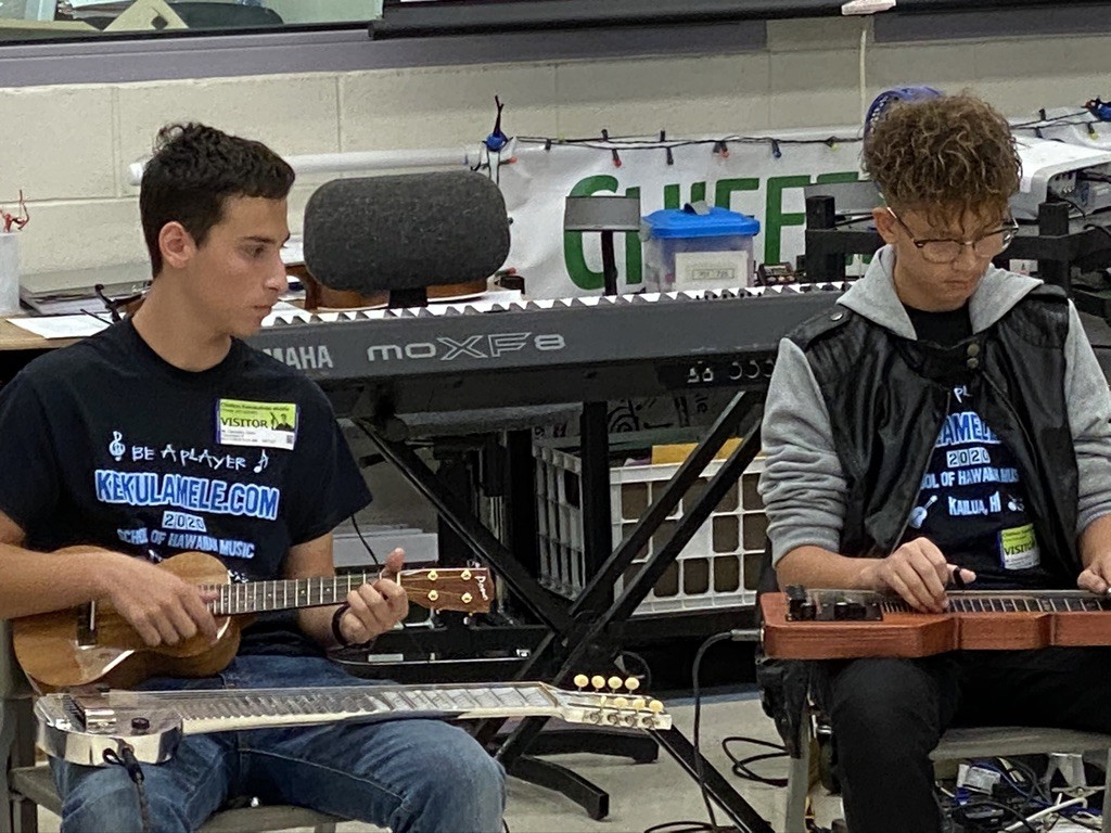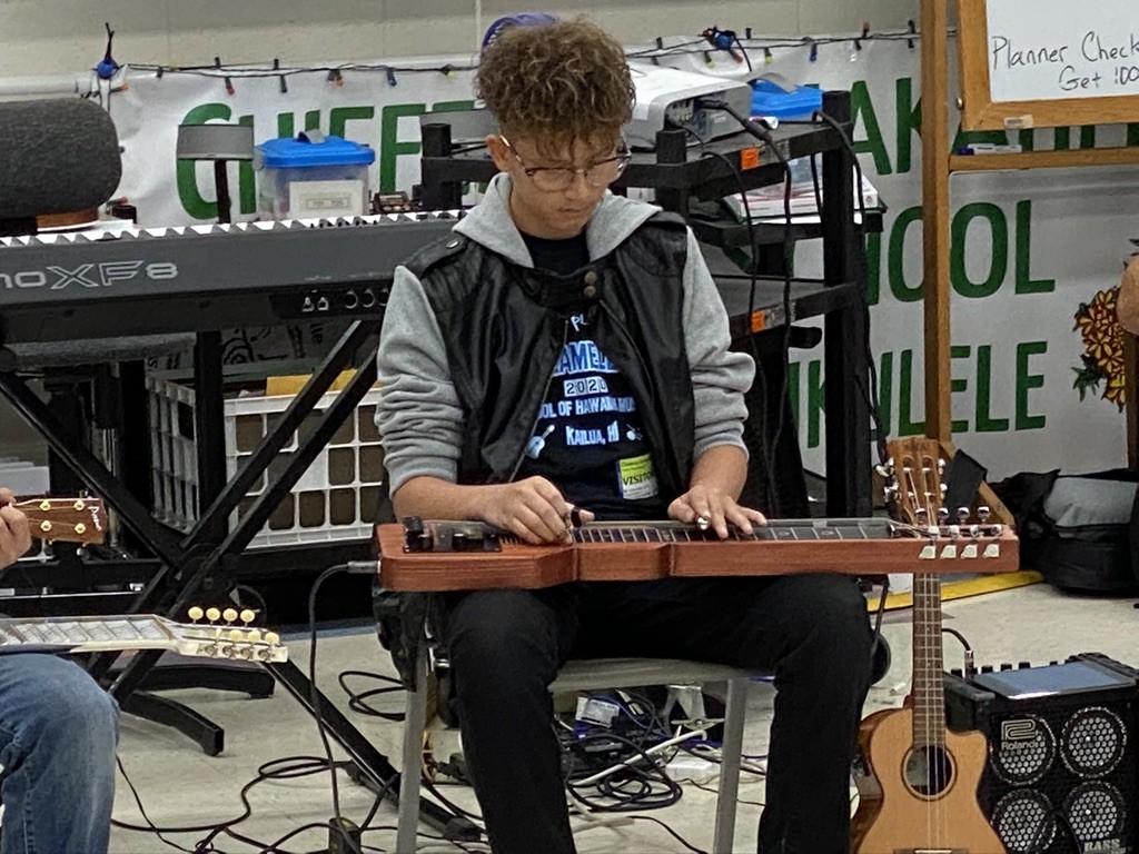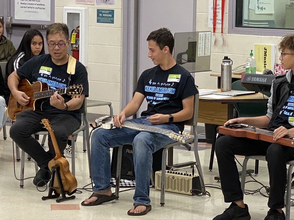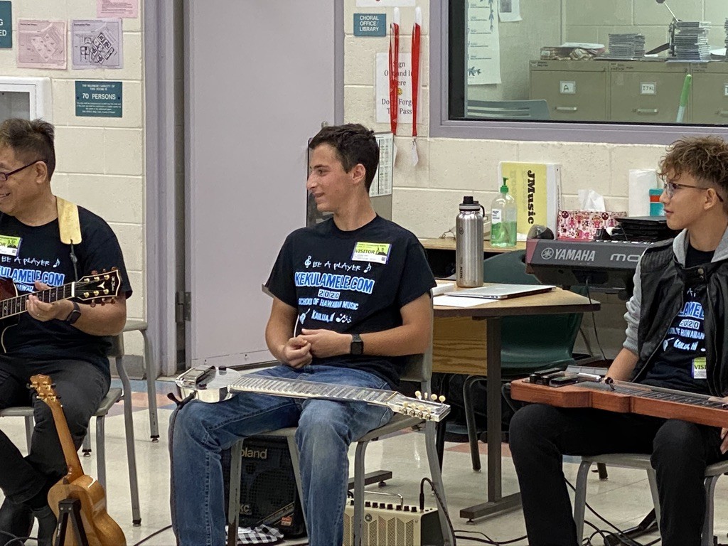 A school demonstration team with NextGen steel guitarists Ethan Goore and Pono Fernandez visited the Chiefess Kamakahelei Middle School to provide a presentation about the Hawaiian Steel Guitar showing students why the instrument is important to Hawaiian music and culture, providing musical selections that include the steel guitar, and giving students hands-on experiences with the instruments. Ethan and Pono were joined by Alan Akaka and Natan Goore who provided musical backup.