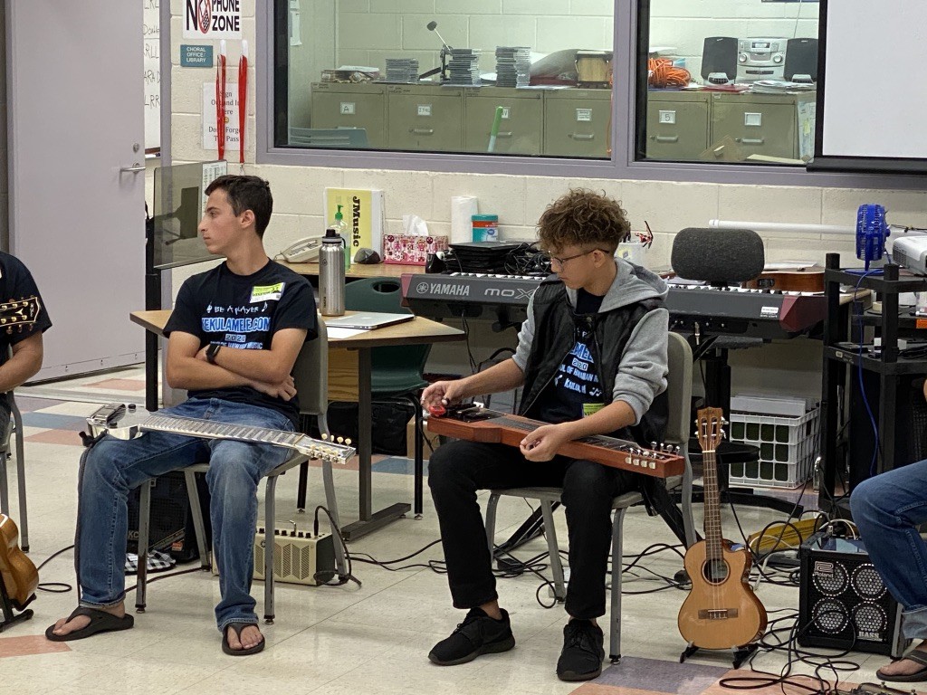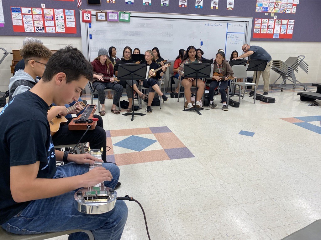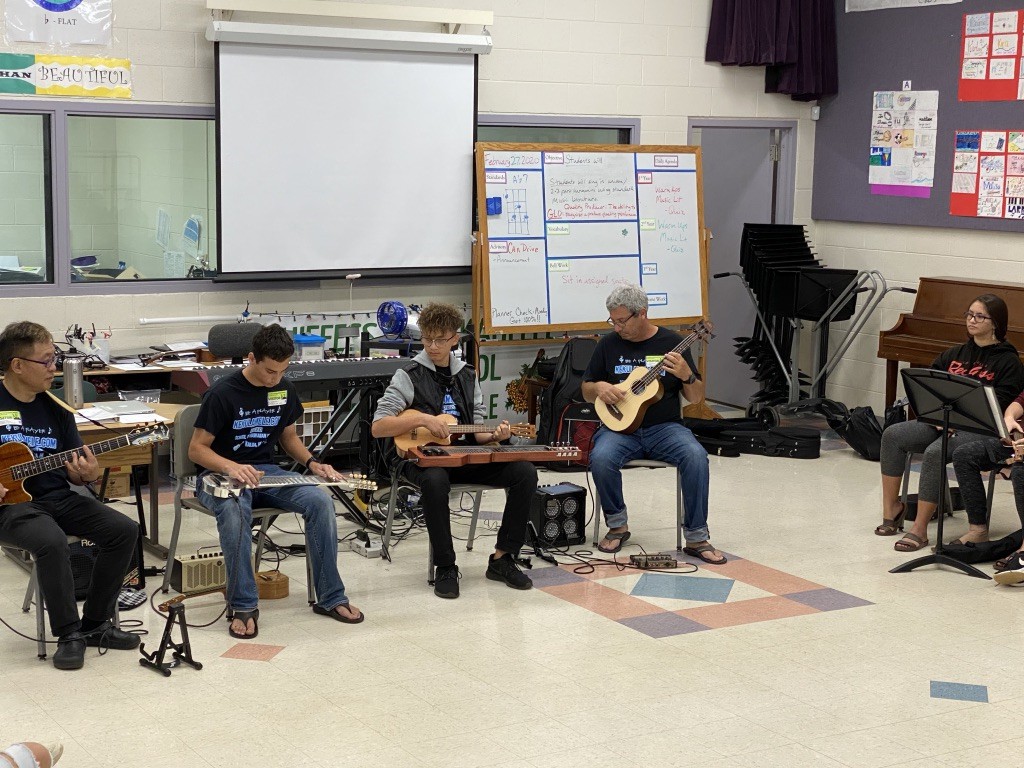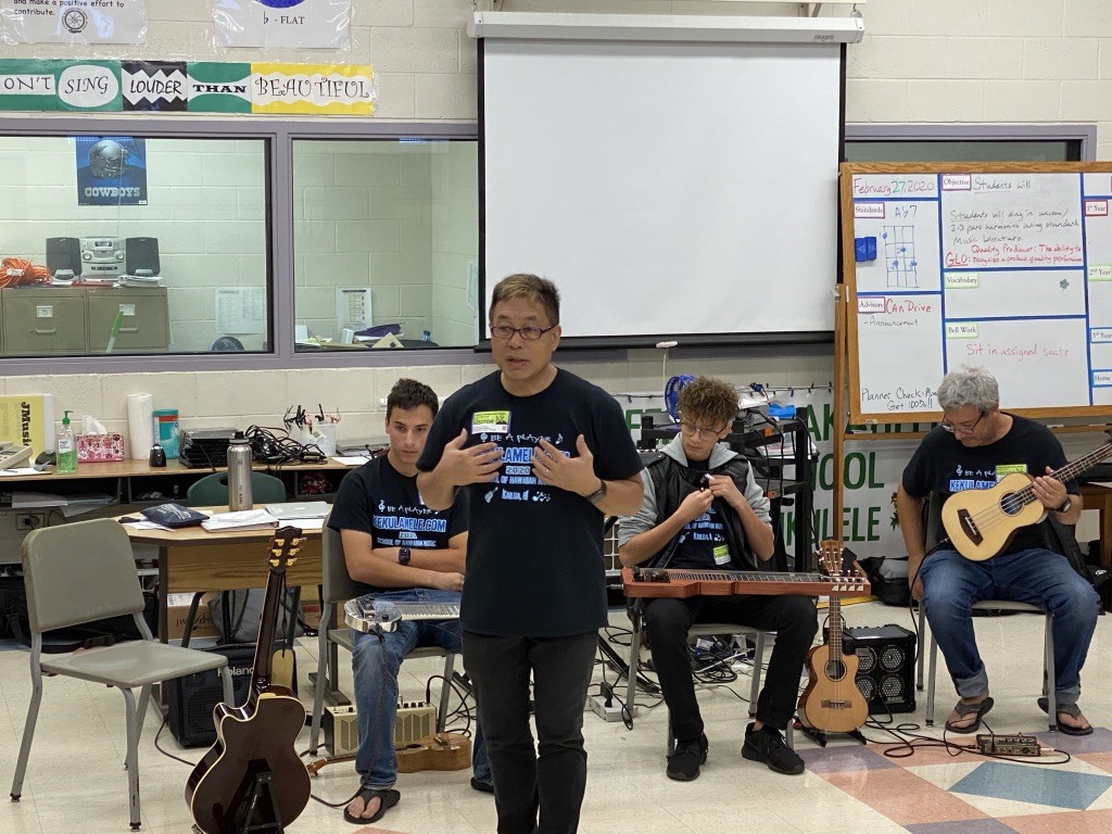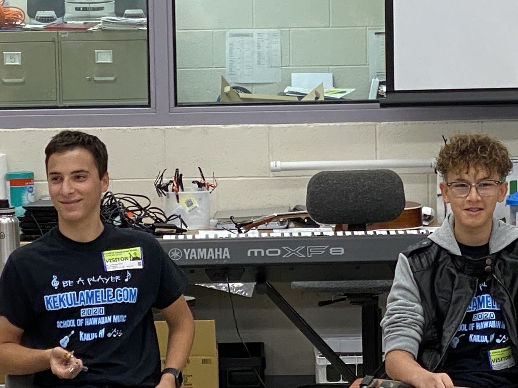 A school demonstration team with NextGen steel guitarists Ethan Goore and Pono Fernandez visited the Chiefess Kamakahelei Middle School to provide a presentation about the Hawaiian Steel Guitar showing students why the instrument is important to Hawaiian music and culture, providing musical selections that include the steel guitar, and giving students hands-on experiences with the instruments. Ethan and Pono were joined by Alan Akaka and Natan Goore who provided musical backup.