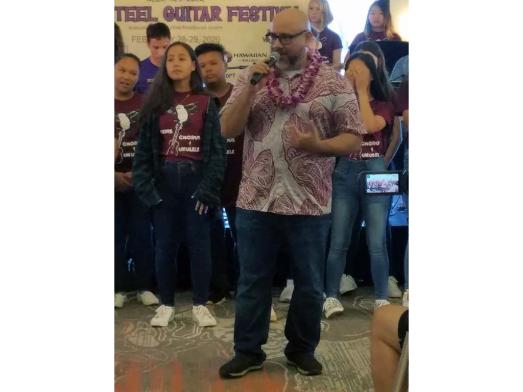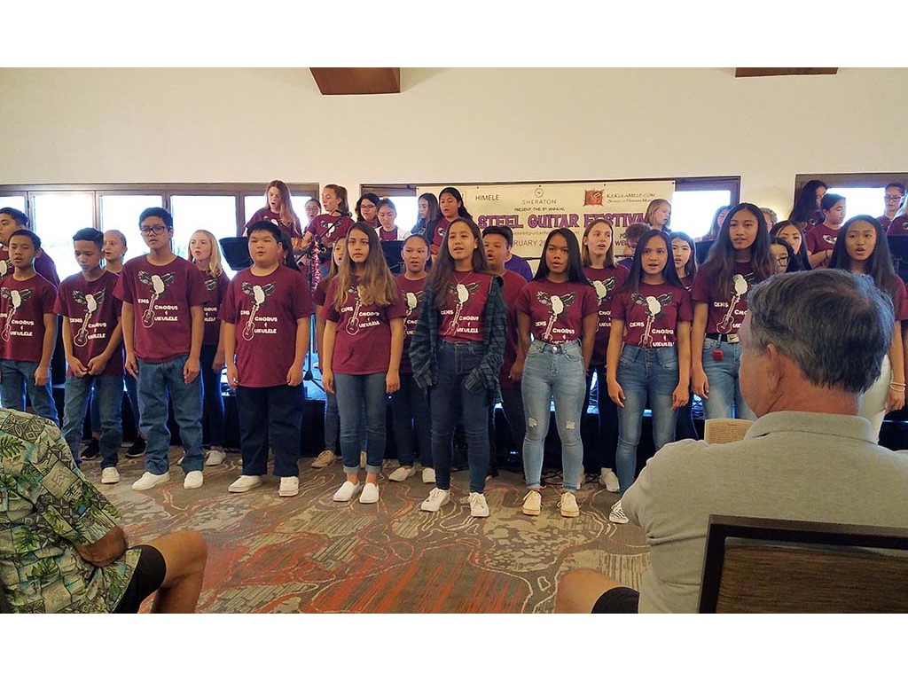NextGen steel guitarists Ethan Goore and Pono Fernandez performed with the Chiefess Kamakahelei Middle School Chorus and 'Ukulele Band. Ethan's dad Natan Goore provided U-bass backup.