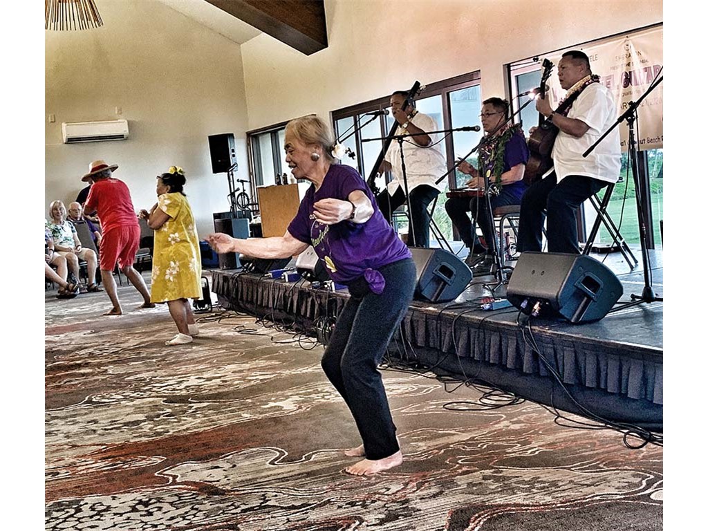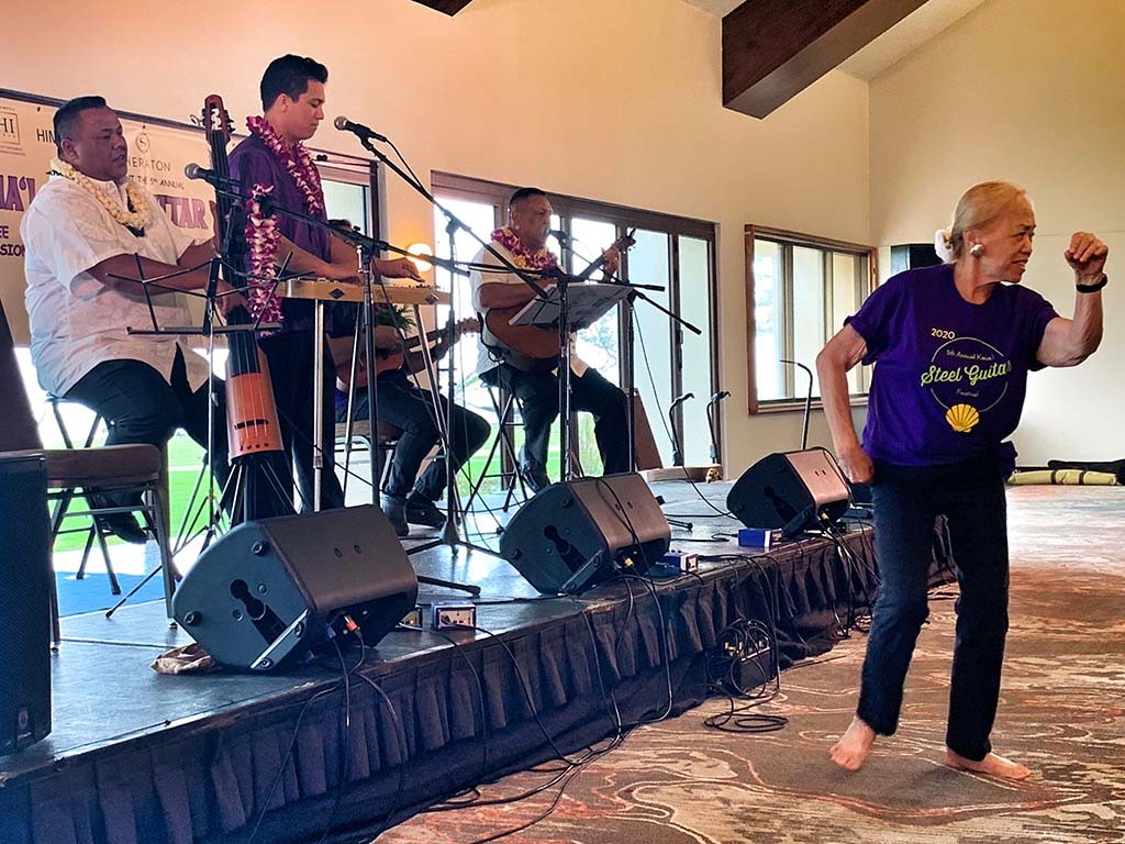 Featured steel guitarist Kapono Lopes with Adam and Kaipo Asing and Auntie Manuiki Lono dancing the hula.