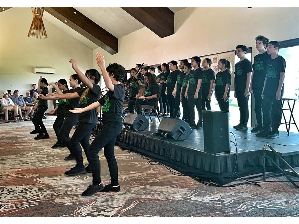 The Kapaʻa Middle School Choir and ʻUkulele Band with director Mary Lardizabal at the keyboard.