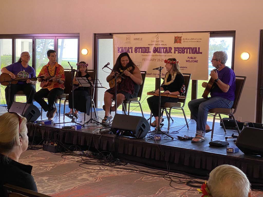 Steel guitarist Heuʻi Bandmann with Rhonda Murotake, Ethan Goore, and Natan Goore.