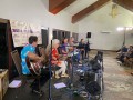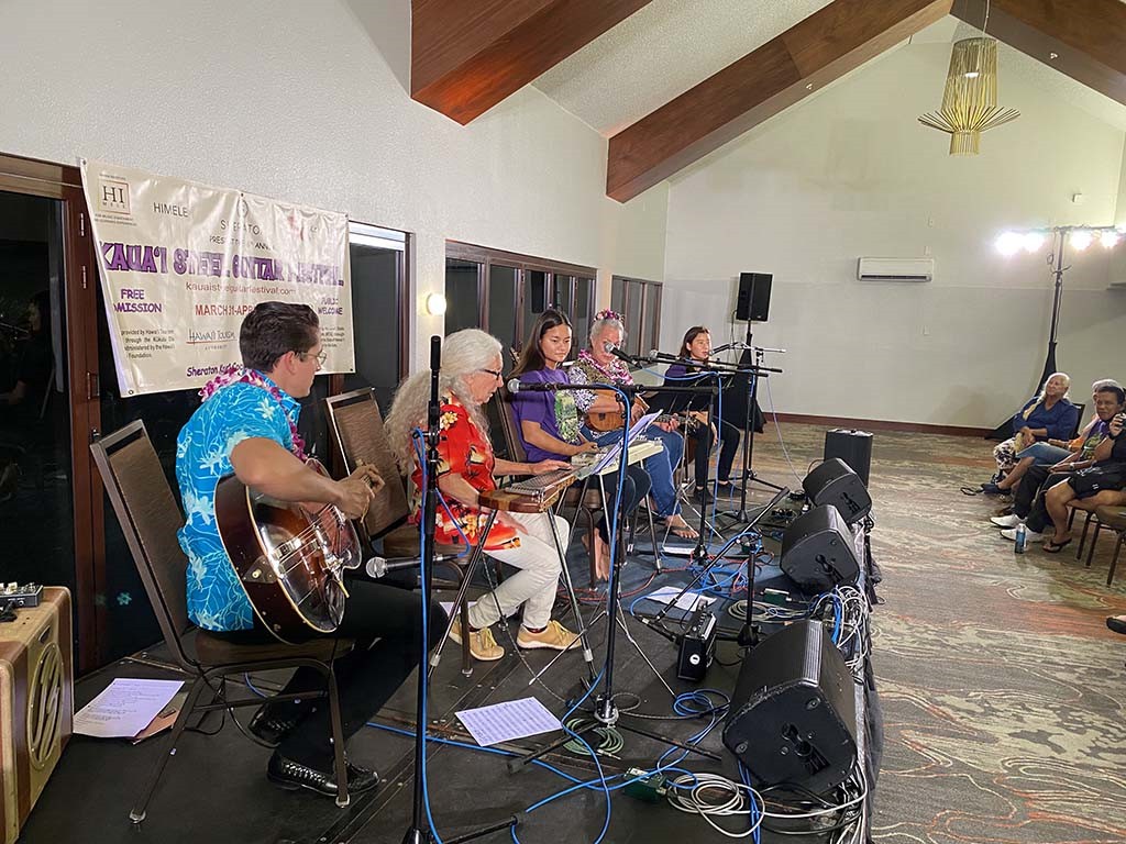 Saturday evening kanikapila musicians from left: Joseph Zayac, Patti Maxine, Joey Misailidis, Helene Woodward, and Tai Misailidis.