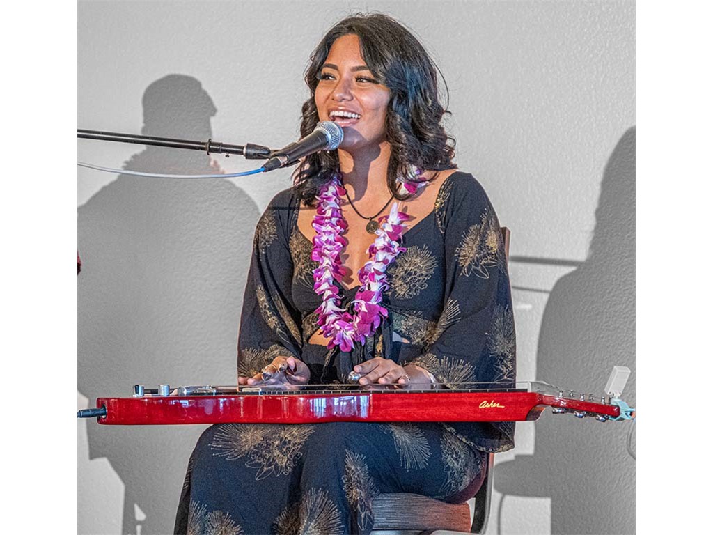 Featured steel guitarist Mālie Lyman showing off her Asher steel guitar.