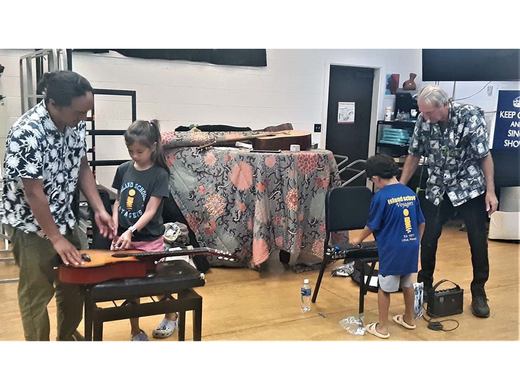 Maluhia Castillo and students try out the steel guitar.